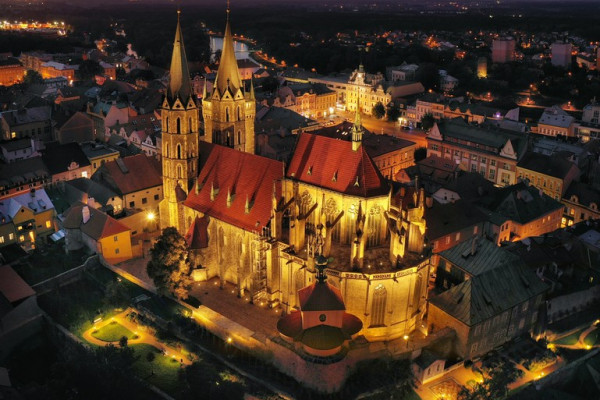 Stavba trojlodní basiliky s trojdílným závěrem začala zřejmě bezprostředně po založení města Přemyslem Otakarem II. (v polovině 50. let 13. století). Jako první byl budován závěr, kolem roku 1270 se předpokládá změna projektu (vložení příčné lodi, změna basiliky na síňové trojlodí), po útlumu za braniborské vlády se začalo stavět západní dvojvěží, průčelí a mezilodní arkády na masivních sloupech. Trojlodí s transeptem bylo dokončeno na přelomu 13. a 14. století.