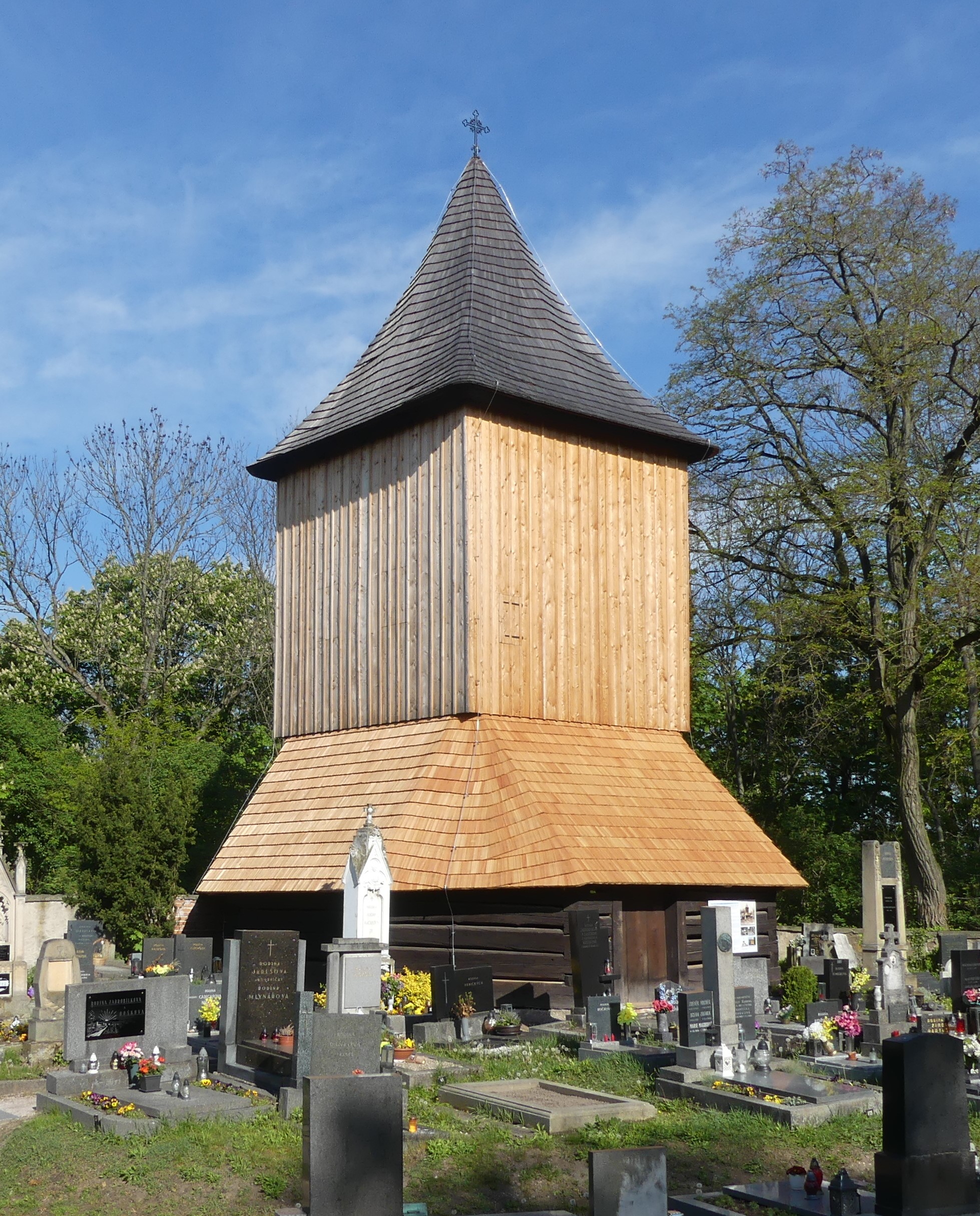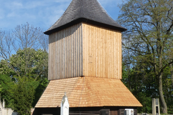 Zvonice byla postavena převážně z dubového dřeva v roce 1605. Jedná se o stavbu vzpěradlovo - štenýřové konstrukce založené na osmibokém roštu, která bývala typická pro podobné sakrální stavby v polabské nížině. Takto zachovalých zvonic je v regionu již málo. Již delší dobu bylo známo, že základový rošt z masivních dubových trámů je velmi poškozený. Zvonice nemá klasické základy, nosná konstrukce je zakotvena právě v základovém roštu, který byl položen na srovnaném terénu. Rošt byl postupně během let a staletí přikrytý zeminou, což způsobilo jeho degradaci - poškození hnilobou. Hrozilo zřícení celé zvonice, která je, spolu s vedlejším kostelem a celým areálem hřbitova, evidovanou kulturní památkou. Přípravné práce vedoucí k záchraně zvonice byly zahájeny v roce 2015, za pana faráře Mons. Františka Hladkého, kdy byla s projektantem uzavřena smlouva o zpracování projektové dokumentace. Její příprava trvala téměř dva roky, bylo nutno podrobně prohlédnout všechny dřevěné prvky stavby, posoudit stupeň poškození a možnost jejich zachování nebo náhrady. Vše bylo konzultováno s památkáři. Podrobná dokumentace byla dokončena a předána v roce 2017. Stavební povolení bylo vydáno v červnu 2018. V červnu 2019 byla uzavřena smlouva o dílo se zhotovitelem a bylo předáno staveniště. Z důvodů technologických i finančních byly práce prováděny po etapách. Práce byly zahájeny v roce 2020, kdy byl vyměněn téměř rozpadlý základový rošt. Kvůli tomu musela být celá mnohatunová zvonice včetně zvonů zdvižena pomocí 9 heverů a posazena na provizorní zděné pilíře. Pro lepší přístup byla zbourána hřbitovní zeď přiléhající ke zvonici. Bylo nutno odstranit velké množství původní navážky z půdorysu zvonice. Vše probíhalo pod pečlivým dohledem archeologů a památkářů, protože zde bylo mj. nalezeno větší množství lidských ostatků. Na podzim 2020 byla zvonice opět usazena na původní místo, ale do nového roštu z ručně tesaných dubových trámů, uloženého na pískovcových pilířích v urovnaném terénu. V roce 2021 a 2022 byla provedena výměna či oprava dřevěných nosných částí konstrukce a narovnání celé zvoničky, která byla nakloněna do strany. Bylo provedeno opláštění i podlaha štenýře z ručně hoblovaných modřínových prken. Nová šindelová střecha je také z modřínu. Práce pokračovaly v letech 2023 a 2024. Bylo dokončeno roubení přízemí, byla znovu sestavena nosná konstrukce „suknice“, pokryta modřínovým šindelem a byly obnovena hřbitovní zeď. Hotová zvonice byla předána vlastníkovi do užívání v červnu 2024. Zajímavostí je, že narovnáním konstrukce zvoničky muselo dojít k převěšení a seřízení dvou stávajících zvonů, které provedla firma AB zvony a hodiny s.r.o., z Petrovic u Karviné. Větší zvon „Jan Václav“ (cca 700 kg) z roku 1583 byl zrekvírován za 2. světové války a nalezen po válce v roce 1947 v Hamburku. Na zvonici byl znovu pověšen v roce 1968 a tehdy již stála zvonice „nakřivo“. Takže po jejím narovnání byl tento zvon natolik nakloněn, že vůbec nebylo možné zvonit. Menší zvon „František Xaver“ z roku 1609 (cca 400 kg) byl také převěšen a dostal i nové srdce. Oba zvony jsou nyní plně funkční a zvoní se na ně ručně, každou neděli před Mší sv. ve vedlejším kostele sv. Jana Křtitele. Máme v plánu pořídit do zvonice třetí zvon, který zde chybí od roku 1917, kdy byl zrekvírován pro vojenské účely. Tím bude zcela dokončena rekonstrukce této unikátní kulturní památky, která slouží více než 4 staletí. A věříme, že hlas zvonů z této zvonice bude znít i příštím generacím. Na financování se podílelo Statutární město Hradec Králové, Královéhradecký kraj a Ministerstvo kultury ČR, za což jim patří velký dík. Díky jejich dotacím je tato krásná historická stavba zachráněna pro další generace. Jiří Horák, starosta obce Vysoká nad Labem