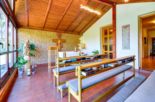 V kapli v prvním poschodí je nový svatostánek od akademického sochaře pana Otmara Olivy a známá kopie kříže z kostelíku sv. Damiána v Assisi, před kterým František uslyšel hlas: "Obnov můj dům!". Sestry zde předkládají Bohu nejen své radosti a starosti, ale také prosby všech, kteří se do jejich modliteb svěřují. Hosté kavárny mohou v době provozu kapli navštívit, nebo se večer připojit ke společné modlitbě sester. I Vy zde můžete napsat svoji prosbu a vložit ji do košíku u sochy Panny Marie.