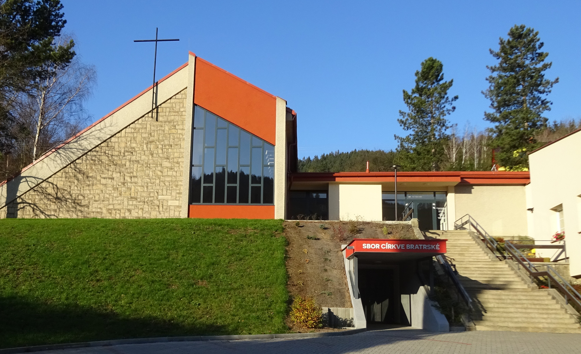Stavba je situována na svažitém terénu v podélném zářezu kopce. Dominantní součástí je velký sál, jehož kapacita je 200 osob, který má vyšší asymetrickou sedlovou střechu. Bočně k němu přiléhá malý sál s kapacitou 60 osob. Oba sály jsou od sebe odděleny skládací dřevěnou stěnou doplněnou o masivní roztahovací závěs přispívající k hlukovému oddělení obou sálů. V hlavní části budovy jsou dále tři klubovny, kuchyň, chodba se šatnou a sociální zařízení. V boční části budovy s rovnou střechou je kancelář sboru, byt kazatele, technické zázemí a garáže v suterénu.