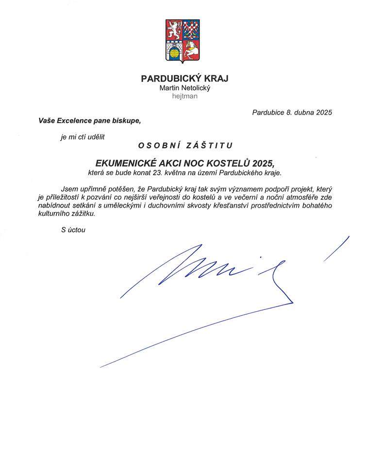 místa spojená s vírou se stala od počátků naší civilizace středobodem lidského společenství. U nás se od středověku v každém jen trochu větším sídle tyčí věžička kostela, která usnadňuje orientaci v krajině a přivádí nás do samého centra. Mnohde jsou ale kostely kromě termínů naplánovaných mší uzavřené. Proto si vážím toho, že se při Noci kostelů můžete v našem kraji podívat do šedesáti z nich, a to v podvečerních, někde i večerních nebo nočních hodinách.