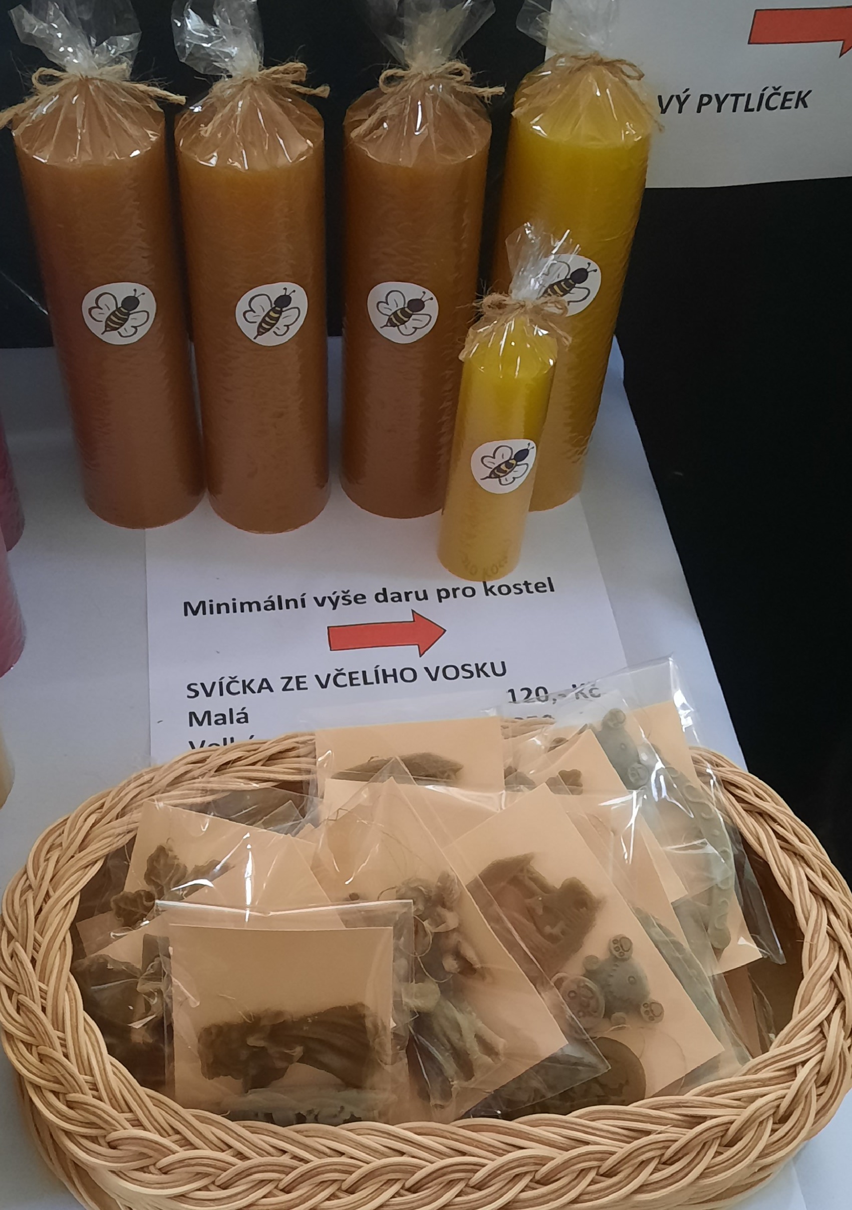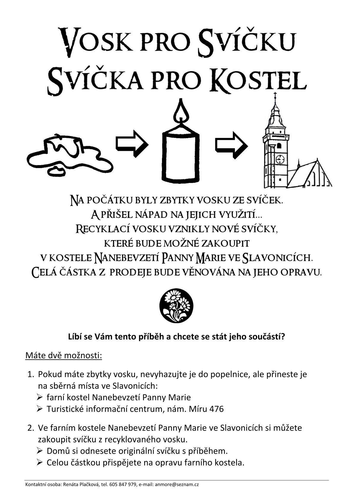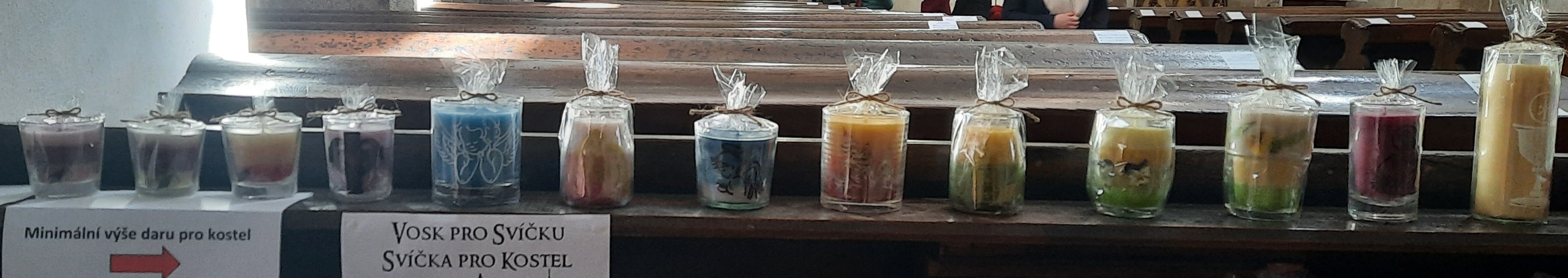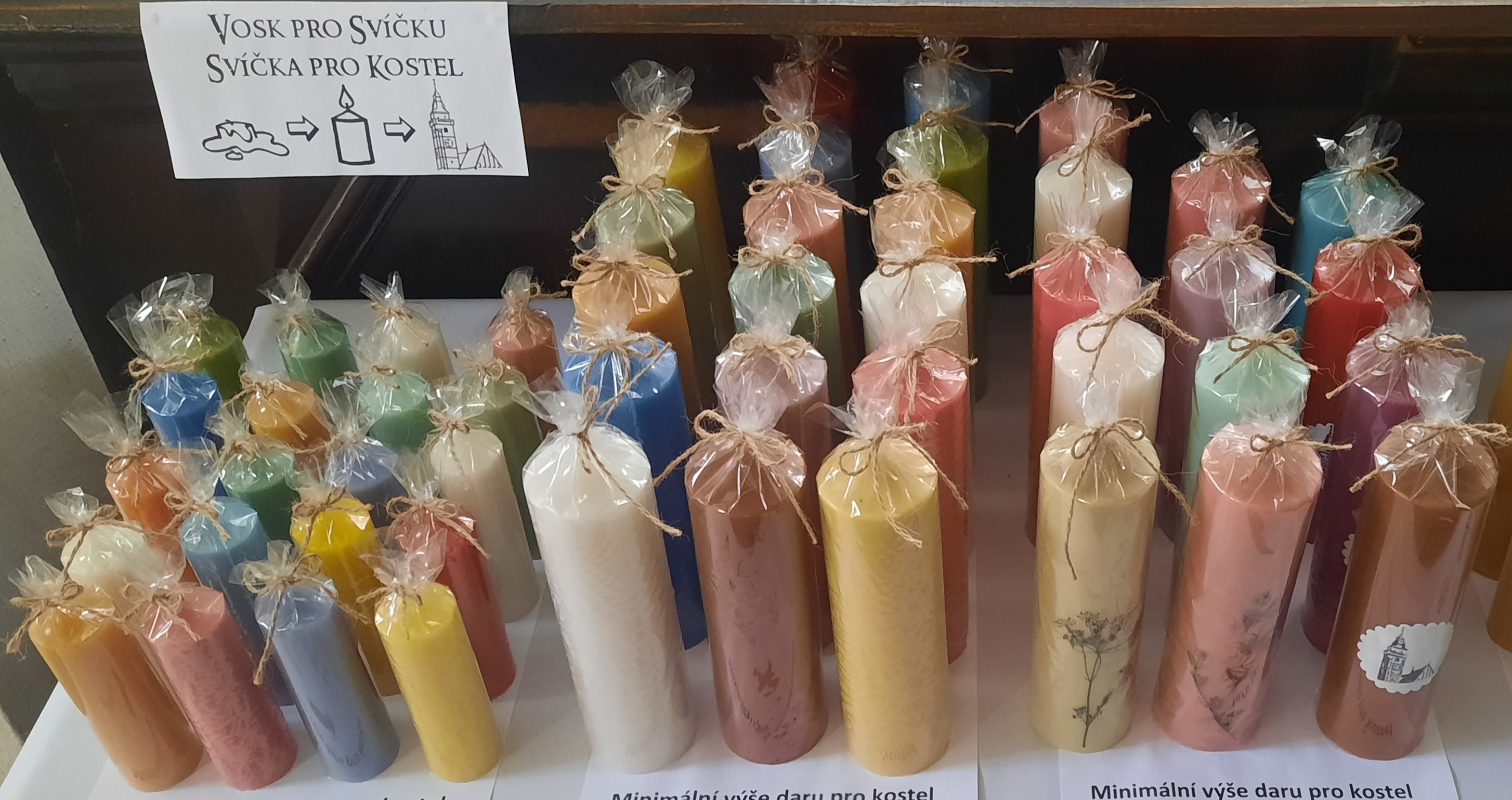V kostele jsou k dispozici svíčky z recyklovaného vosku v rámci farního projektu na podporu opravy kostela.