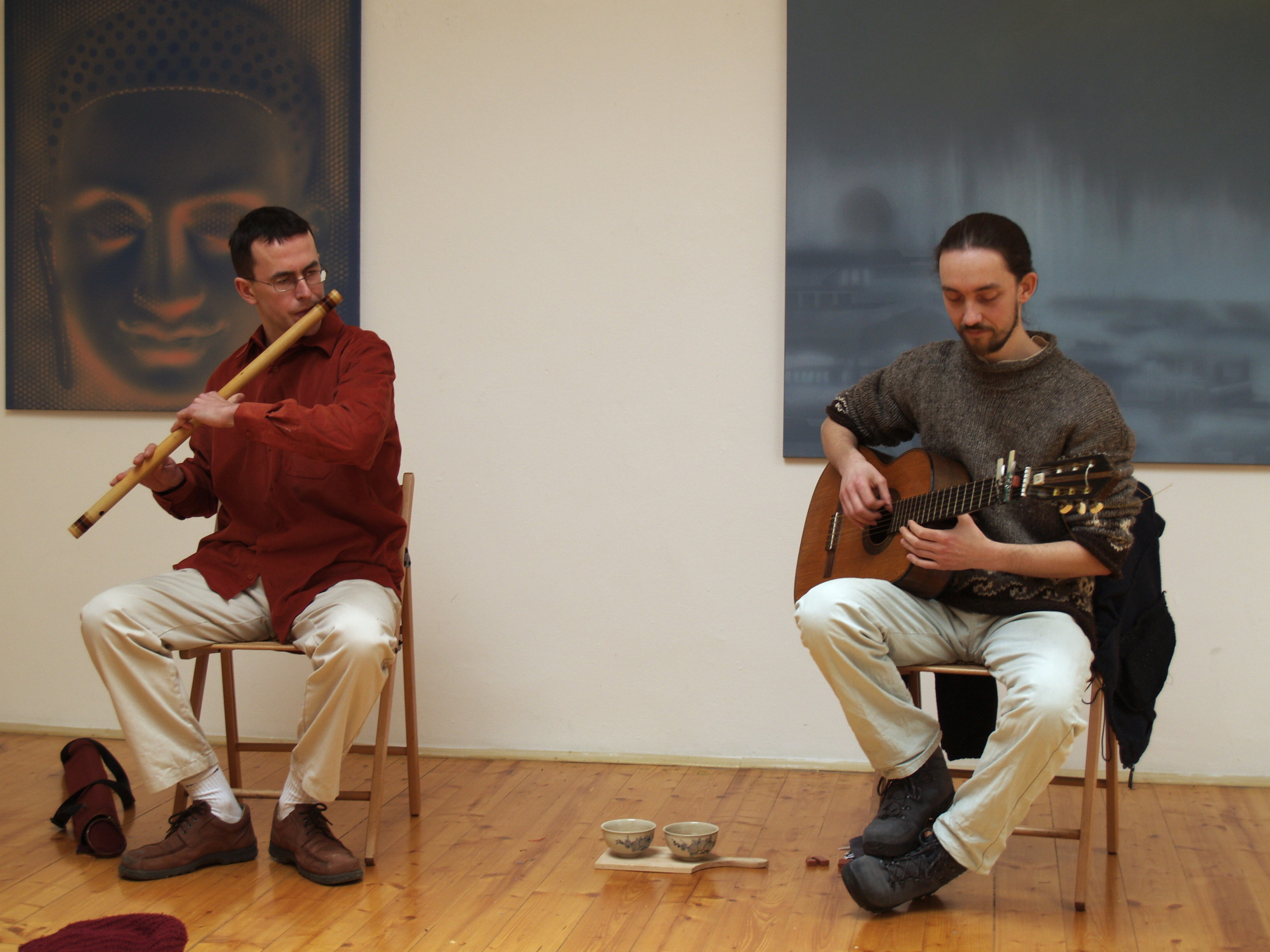 Petr Korbelář a Jan Kotulán hrají - hudbu a patrně je jim lhostejné, kam si ji posluchač zařadí. Korbelář hraje na klapkodastrovou kytaru, Kotulán na indickou bambusovou flétnu. Vytvářejí plochy a dlouhé příběhy, jejich nástroje se proplétají a kolotají umně propojené v řetězce, hady či jen vlnění a chvění. Skladby se stopáží i několika desítek minut přinášejí klid, horizontální vyrovnání, mír. Jednotlivé skladby nemají názvy - nač také?