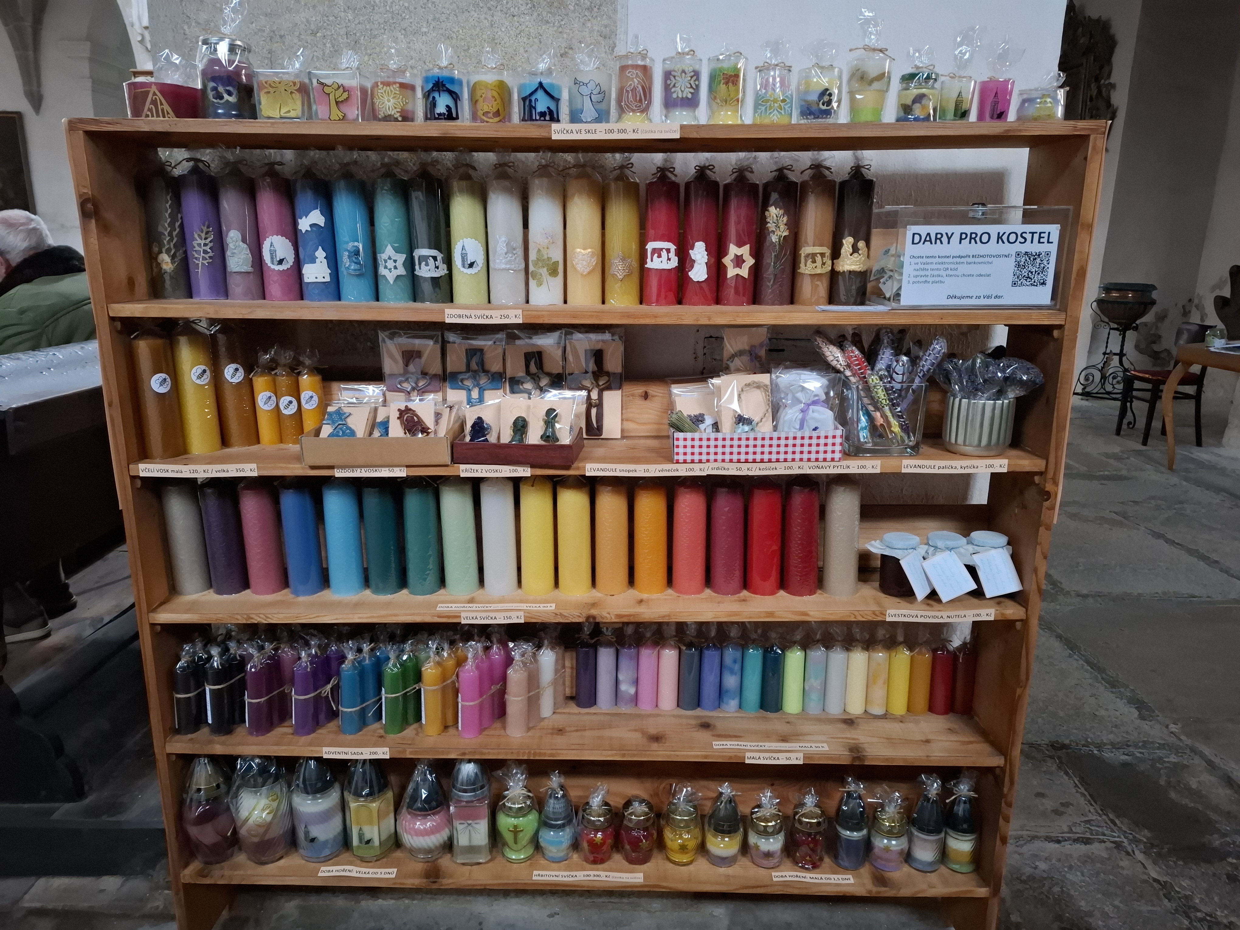 V kostele jsou k dispozici svíčky z recyklovaného vosku v rámci farního projektu na podporu opravy kostela.