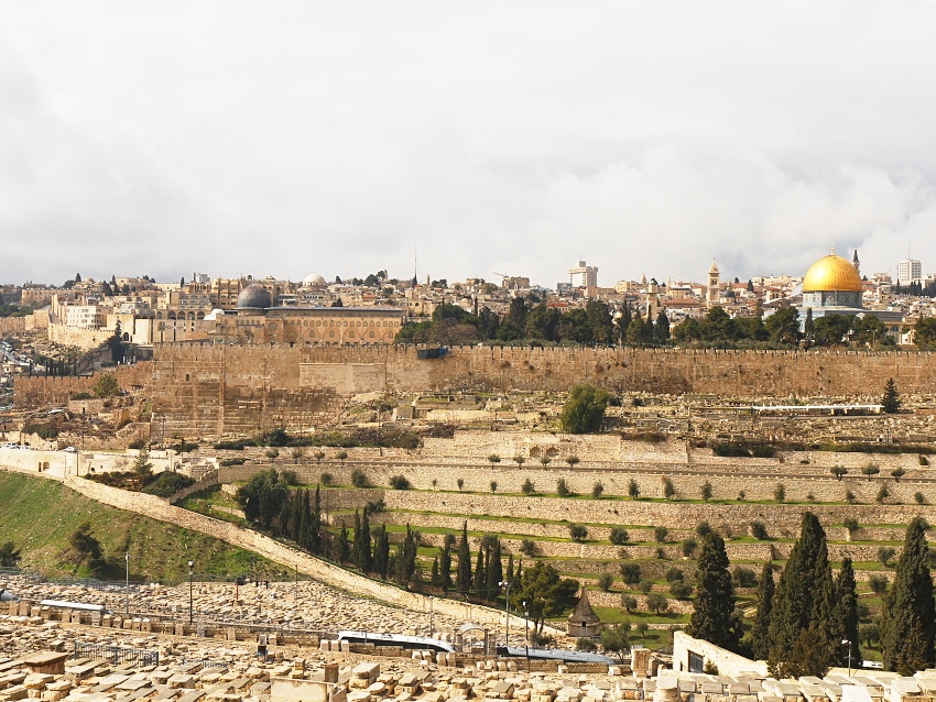 (Fotografie zachycuje Jeruzalém a jeho nejvyšší místo, kde je Chrámová hora obepnutá dlouhou hradbou. Dnes tomuto nádvoří vévodí Omarova mešita se zlatou kupolí.)