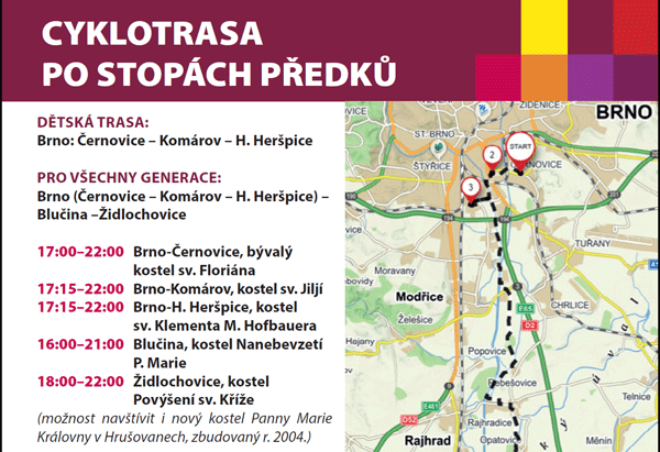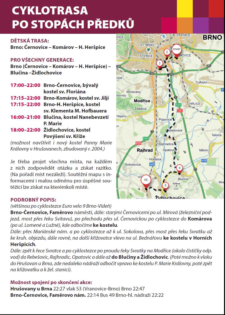 Dále: přes Mariánské nám. a po cyklostezce až k ul. Sokolova, přes most přes řeku Svratku až ke kruh. objezdu, dále rovně, na další křižovatce vlevo na ul. Bednářovu ke kostelu v Horních Heršpicích.