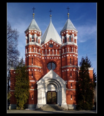 Novorománský kostel nezvyklého vzhledu, připomínající porýnské románské kostely, postavený z neomítnutých červených cihel a pískovcových stavebních prvků, byl vystavěn v letech 1884–1887. Architekti R. Jordan a J. Schmalzhofer z Vídně. Postavil jej místní stavitel F. Schloz. Společně realizovali desítky sakrálních staveb po celé monarchii. Nekolik kostelů ve Vídni, ale např. také kostel sv. Josefa ve Svitavách a kostel Panny Marie ve slovinském hlavním městě Mariboru.