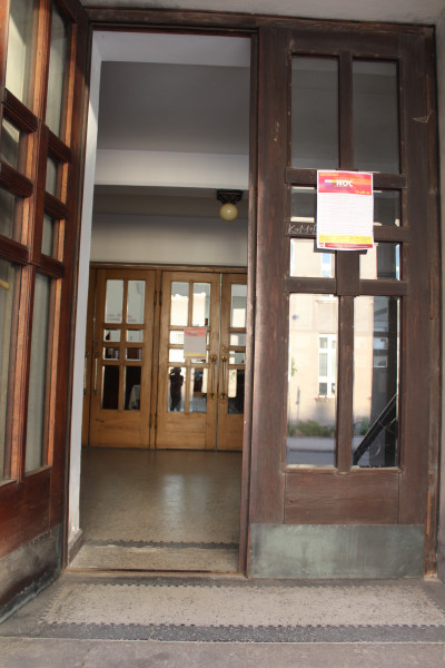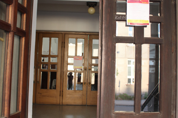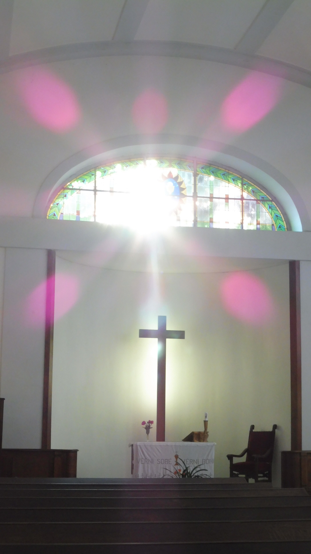 Před sborem stojí autobusová zastávka s názvem: Dvůr Králové n.L.,,pošta