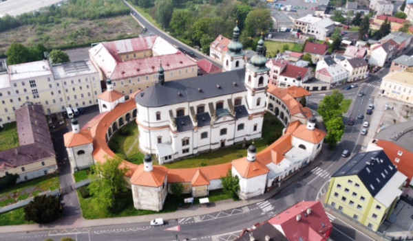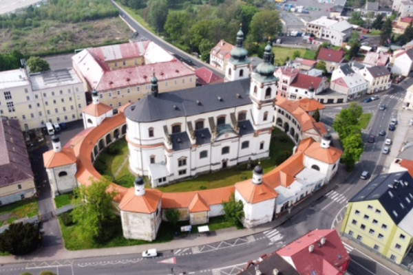Bazilika byla vysvěcena v roce 1706, je postavena italskými staviteli Juliem a jeho synem Octavianem Broggiovými, stejně jako jiné kostely té doby, v barokním slohu. Dvě vysoké cibulovitě zakončené věže se zlatými kříži hlásí do světa, že se jedná o místo rozjímání. Hlavní štít zdobí pozlacený kříž, jehož kamenný podstavec nese vzadu jména stavitelů. Figury svatých, které se nachází na atice a štítu, Pieta nad vchodem, doplňují nádherný dojem a ukazují ducha a vkus stavitelů. Celá stavba kostela se ve svém půdorysu inspiruje kostelem Il Jesu od stavitele Vignoly v Římě a ambity vedoucí kolem baziliky jsou ovlivněny stavitelem Berninim.