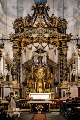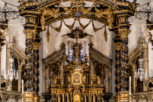 Na barokních sloupech se tyčí baldachýn s glóbem, nad ním se nachází dva andělé nesoucí kříž. Bohaté množství vyřezávaných květinových girland, vábivé hlavy andělů a další postavy zdobí výšky oltáře, zatímco kolem vlastního oltáře se řadí dvanáct apoštolů.