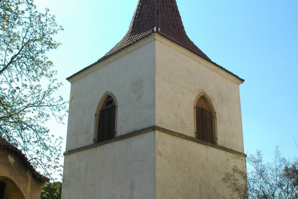 Samostatná kamenná zvonice mívala tři zvony, zachovaly se dva. Velký zvon Panny Marie nese reliéf staroboleslavského Palladia a pochází pravděpodobně z konce 18. století. Menší, starší (ze 14. století?) zvon Evangelistů je tzv. umíráček.