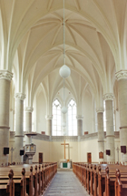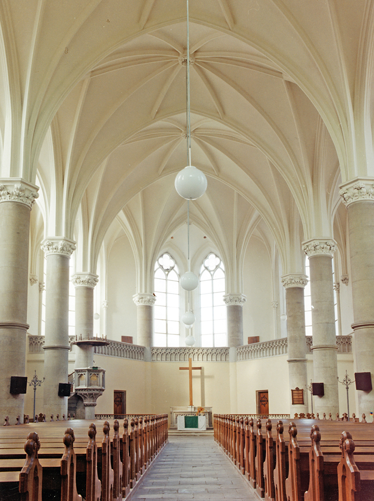 Trojlodní kostel s neobvyklou tribunou v závěru apsidy je dlouhý 45 m. Věž je vysoká 51 m. Z vnitřního vybavení je vzácná mramorová kazatelna se symboly čtyř evangelistů, oltář a křtitelnice. Varhany od firmy Rieger jsou z roku 1887. V někdejší křestní kapli je pamětní deska připomínají zmiňovaného prvního německého evangelického kazatele.