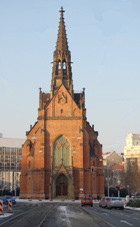Votivkirche na vídeňské Ringstrasse. Stavba je ovlivněna severoněmeckým novogotickým slohem, pro který je charakteristické právě červené zdivo.