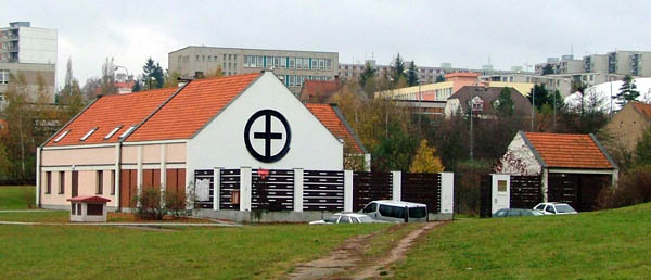 Sborový dům z roku 1999 - na křižovatce ulic Studentská a Plaská, na dolním okraji Bolevecké návsi.