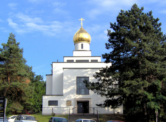 Chrám sv. Václava se nachází v centru Brna na úpatí hradu Špilberk. Za první republiky neudržovaná a nebezpečná lokalita se díky vyhlášení hradu a parku za národní kulturní památku stala v průběhu let vyhledávaným místem procházek. Chrám je solitérní stavbou zasazenou do zeleně jednoho z největších brněnských parků. Neodmyslitelně patří k siluetě hradu a parku, je součástí městské památkové rezervace a národní kulturní památkou. Plán vypracoval Ing. arch. Petr Levický a stavbu provedl stavitel Vladimír Stavíček v letech 1930-31. Hlavní vnitřní prostor chrámu má tvar jednoduchého hranolu o půdorysných rozměrech 11 x 9,6 metrů a výšce 9,5 metrů. Do jeho stěn jsou prolomeny čtyři niky o světlé výšce 8 metrů. Vnitřní výzdoba chrámu se omezila pouze na vitráže v prostorných okenních otvorech. Ty však byly zcela zničeny během 2. světové války. V původní architektonické výbavě chrámu byla vitráž sv. Václava na koni nad vchodem do chrámu, v levém bočním okně sv. Prokop, na pravé straně sv. Anna a konečně v oltářní části bylo zobrazeno slavné Kristovo vzkříšení. Ve zvonici bylo pět vysvěcených zvonů a po obou stranách chrámové lodě 36 sklápěcích křesel pro staré a nemocné. Hlavním prvkem interiéru je ikonostas. Je zbudován ze základní řady kamenných desek červeného zabarvení, na kterých spočívá osmice sloupků ze zeleného kamene, jež nesou opět řadu kamenných desek. Ikony vsazené mezi sloupky jsou dílem akademické malířky Olgy Djačenkové. Datují se do doby vzniku chrámu. Jedná se o ikonu sv. Václava, sv. Ludmily, archanděla Gabriela, archanděla Michaela, Přesvaté Bohorodice a Krista Spasitele. Nad královskými dveřmi v horní desce je zasazena kruhová ikona Poslední večeře. Výplně otvoru, kování, zábradlí a další interiérové detaily se dochovaly v plném rozsahu. Za zmínku stojí také výborná akustika chrámu. Stavitel Levický musel respektovat kánony církevního stavitelství, ale především navrhnout stavbu, kterou přijme věřící pravoslavný lid, stavbu milou srdci tohoto lidu. Levický se však neuchyluje ke kopírování starých vzorů, což je u soudobých autorů časté, naopak abstrahuje schéma tradičního pravoslavného chrámu v duchu soudobé puristické estetiky. Při kompozici objektu pracuje s čistými objemy hranolu, na jejichž průniku staví podobu vnitřního prostoru chrámu. Tím je schéma vepsaného kříže. Celá stavba graduje věží zakončenou kopulí ruského typu. Ta spolu s motivem kříže přítomným jak v interiéru, tak v siluetě budovy jednoznačně určuje sakrální účel stavby. Vnější podoba je, zcela podle dobových zásad funkcionalismu, podřízena jejímu vnitřnímu uspořádání. Umístění oken a dveří je pečlivě komponováno. Takto vzniklý prostor je přirozeně monumentální, působí slavnostně, ale zároveň lidsky příjemně. Jsme zde svědky užití principu moderní architektury a zároveň tradičních proporčních a kompozičních pravidel. K areálu pravoslavného chrámu patří také zvonice s křtitelnicí, navržená v roce 1991 Luborem Lacinou, který patřil k významným brněnským architektům doby nedávné. V roce 2003 provedla naše brněnská obec obnovu a částečnou úpravu vnějšího vzhledu farního chrámu sv. Václava, která sestávala z několika částí. Nejvýraznější a pro pravoslavného křesťana vpravdě nejradostnější bylo pozlacení tehdejší měděné kopule. Pro zlacení bylo použito nejkvalitnější čtyřiadvacetikarátové plátkové zlato. Kopule se tak stala z dálkových pohledů mnohem výraznější. Chrám dnes září v novém důstojném kabátě, který mohl obléknout díky hojnému Božímu požehnání a milosti.