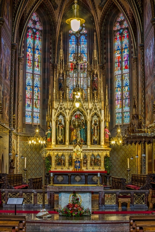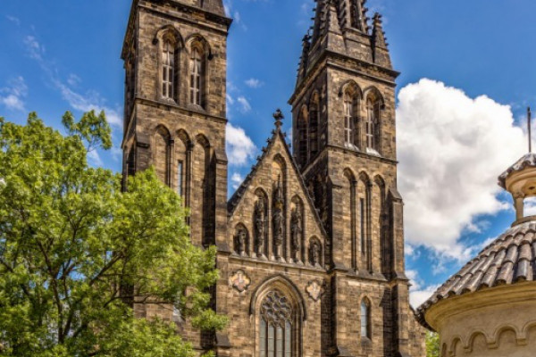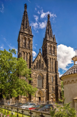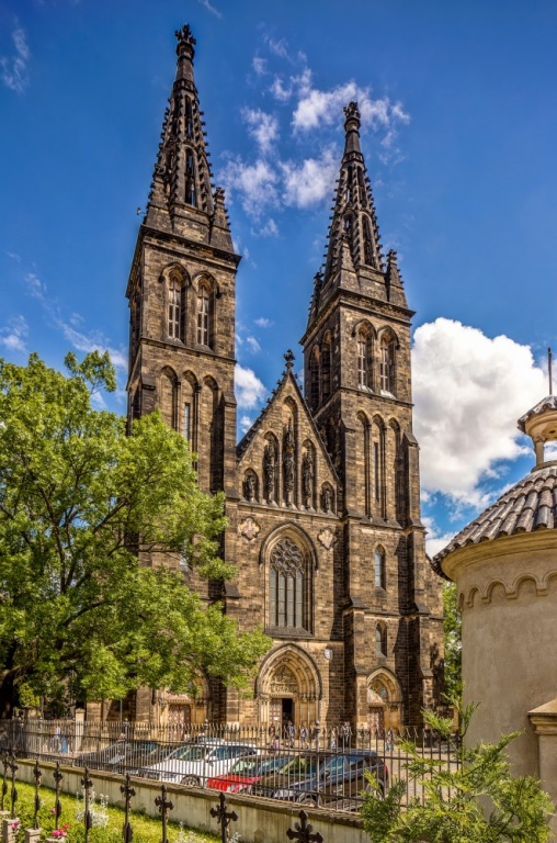 MÍSTO JUBILEJNÍHO SVATÉHO ROKU 2025 SPOJENÉHO S PLNOMOCNÝMI ODPUSTKY. Kapitulní chrám sv. apoštolů Petra a Pavla na Vyšehradě ve své nynější podobě je trojlodní pseudobazilika s kaplemi při bočních lodích, hloubkovým, trojboce uzavřeným kněžištěm se sakristií a kaplí na bočních stranách. Po stranách průčelí stojí dvojice věží. Fasády kostela mají náročnou novogotickou úpravu. Bohatě je upraveno zejména průčelí s portály a věže.