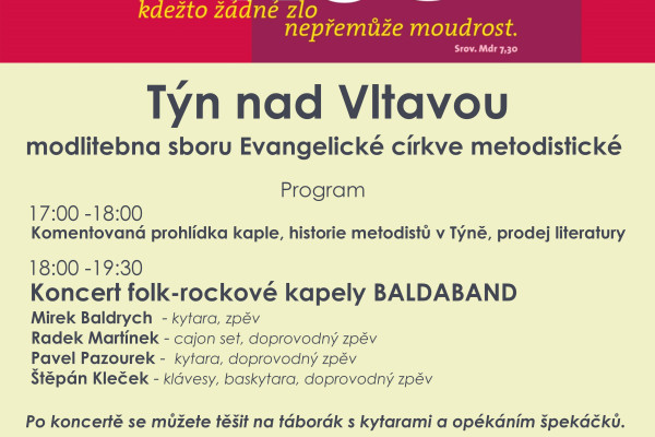 V 17.00 koncert folkrokové skupiny BALDABAND. Pro všechny milovníky musikantských lahůdek. Po vystoupení zveme všechny k opékání buřtů nad otevřeným ohněm a kytaře.