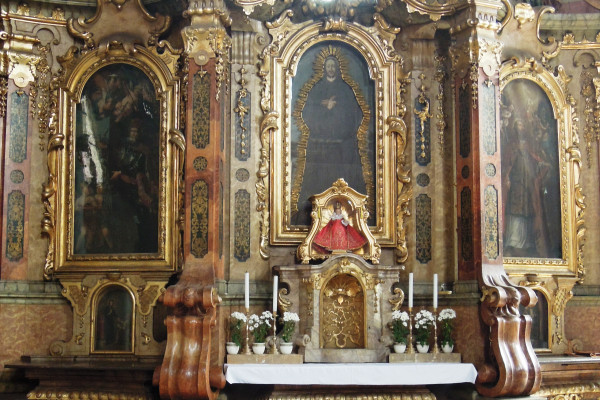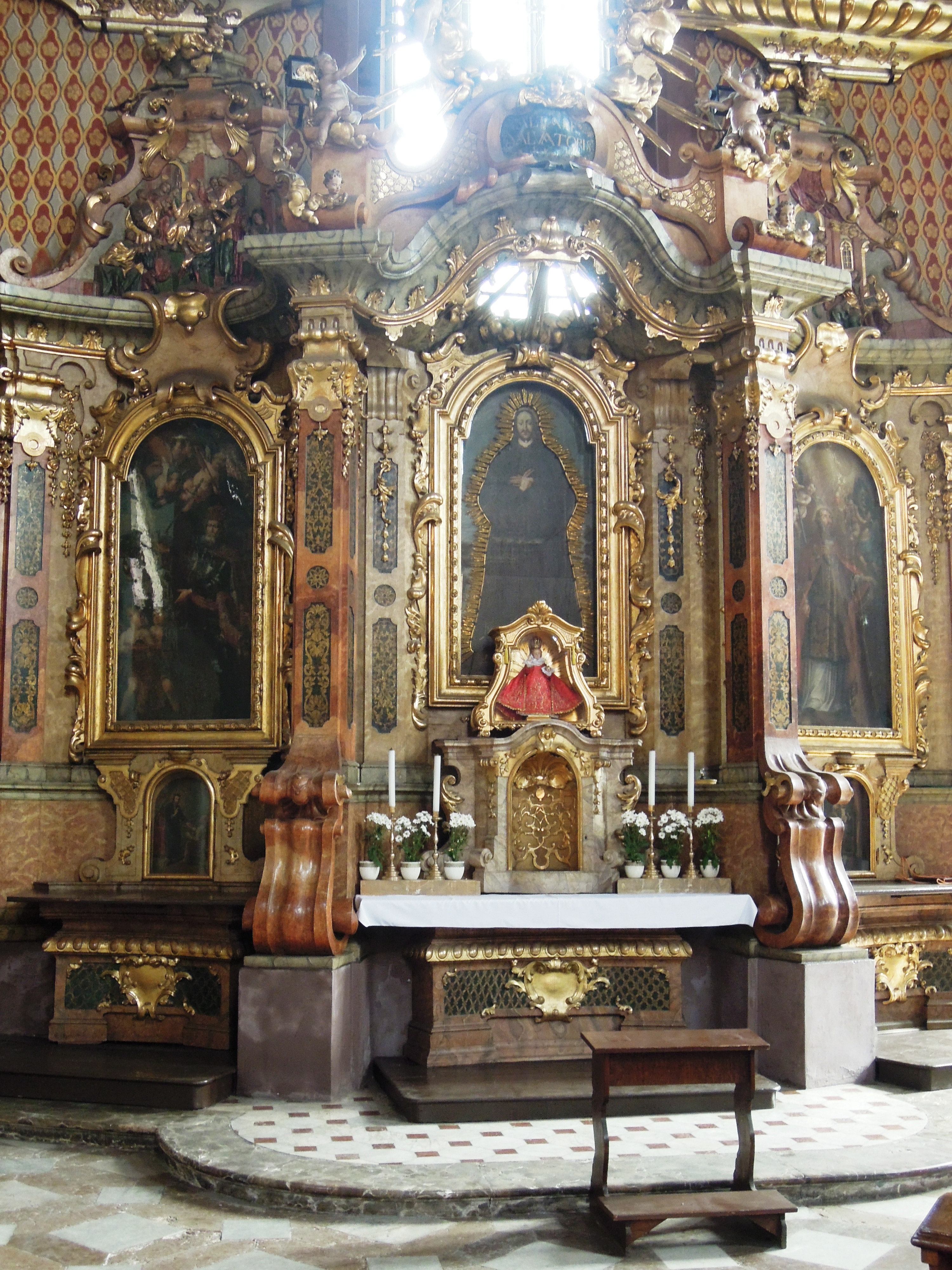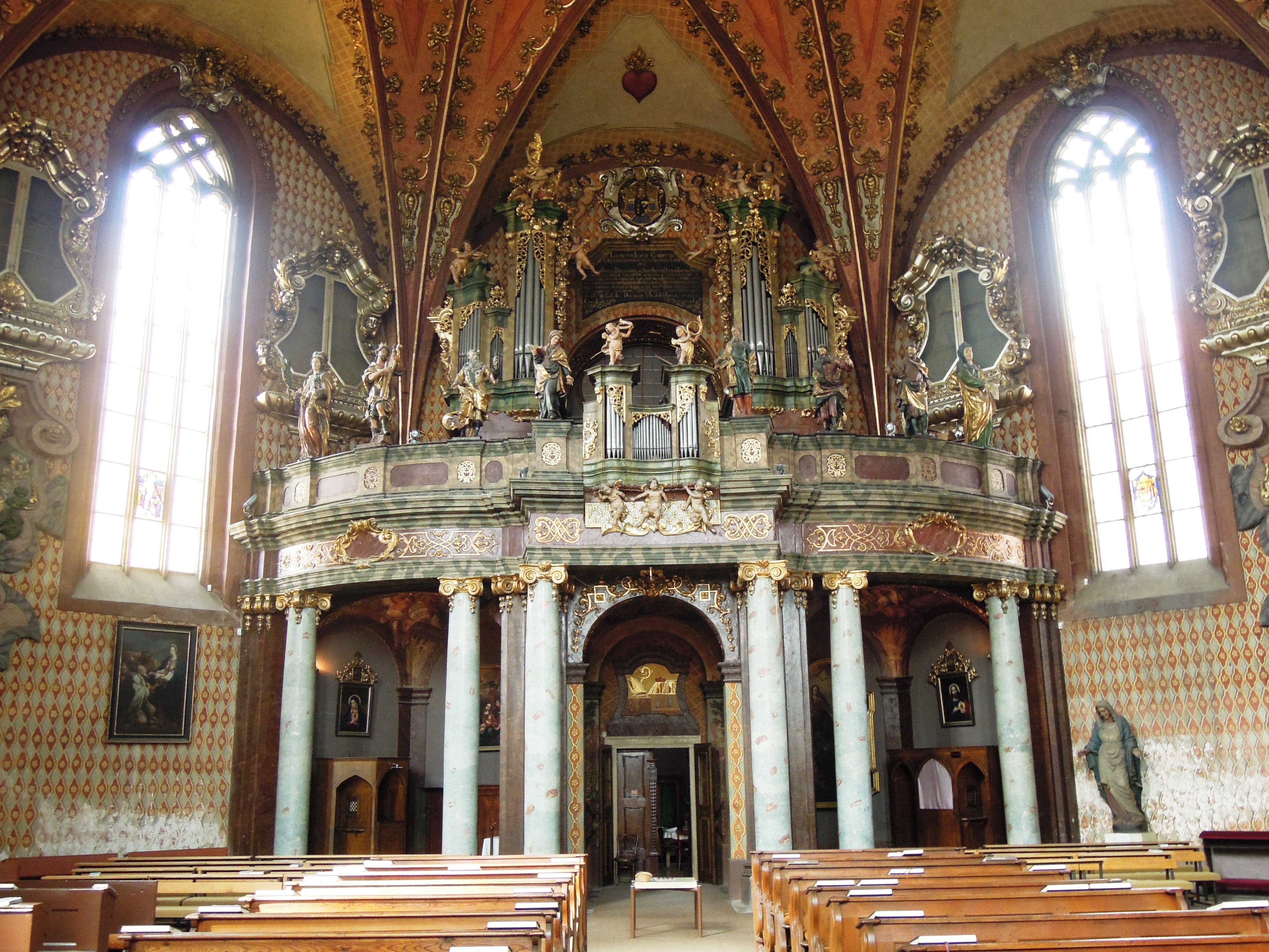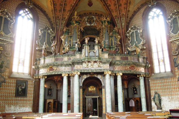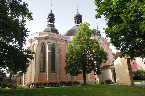 Kostel má pro vrcholně gotickou architekturu naprosto netypickou osmibokou dispozici hlavní lodě, které dominuje barokní inventář a výzdoba. Loď je zaklenuta nádhernou renesanční klenbou o průměru 22,8 m. Dominantou presbyteria je novogotický oltář s triptichem od malíře Antonína Lhoty. Centrálním obrazem je zachycena scéna Nanebevzetí Panny Marie, boční části pak představují svatého Václava a sv. Karla Velikého. V jižní části kostela byla na přelomu 17. a 18. století vybudována monumentální kaple, zvaná Malá Palestina nebo Kaple Svatých schodů, jejíž součástí jsou Svaté schody, kaple Božího hrobu a Betlémská jeskyně. Projektantem byl velice pravděpodobně slavný stavitel Jan Blažej Santini-Aichel.