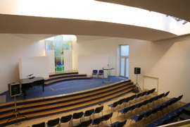 Prohlídka moderní modlitebny v centru města, vitráž, baptisterium, zázemí. |