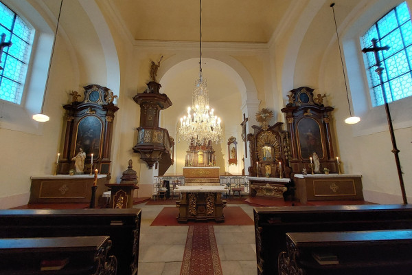 V místech původní hradní kaple zasvěcené sv. Kateřině, byla v roce 1724 postavena nynější zámecká kaple a od roku 1857 farní kostel Povýšení sv. Kříže.