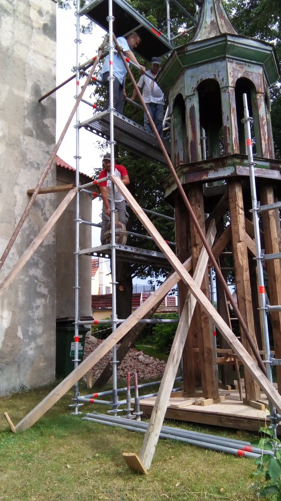 Fotodokumentace z probíhající opravy střechy kostelní věže :