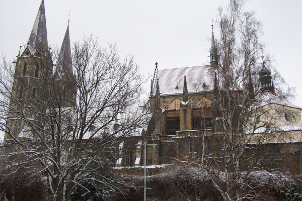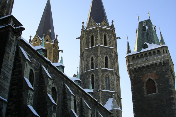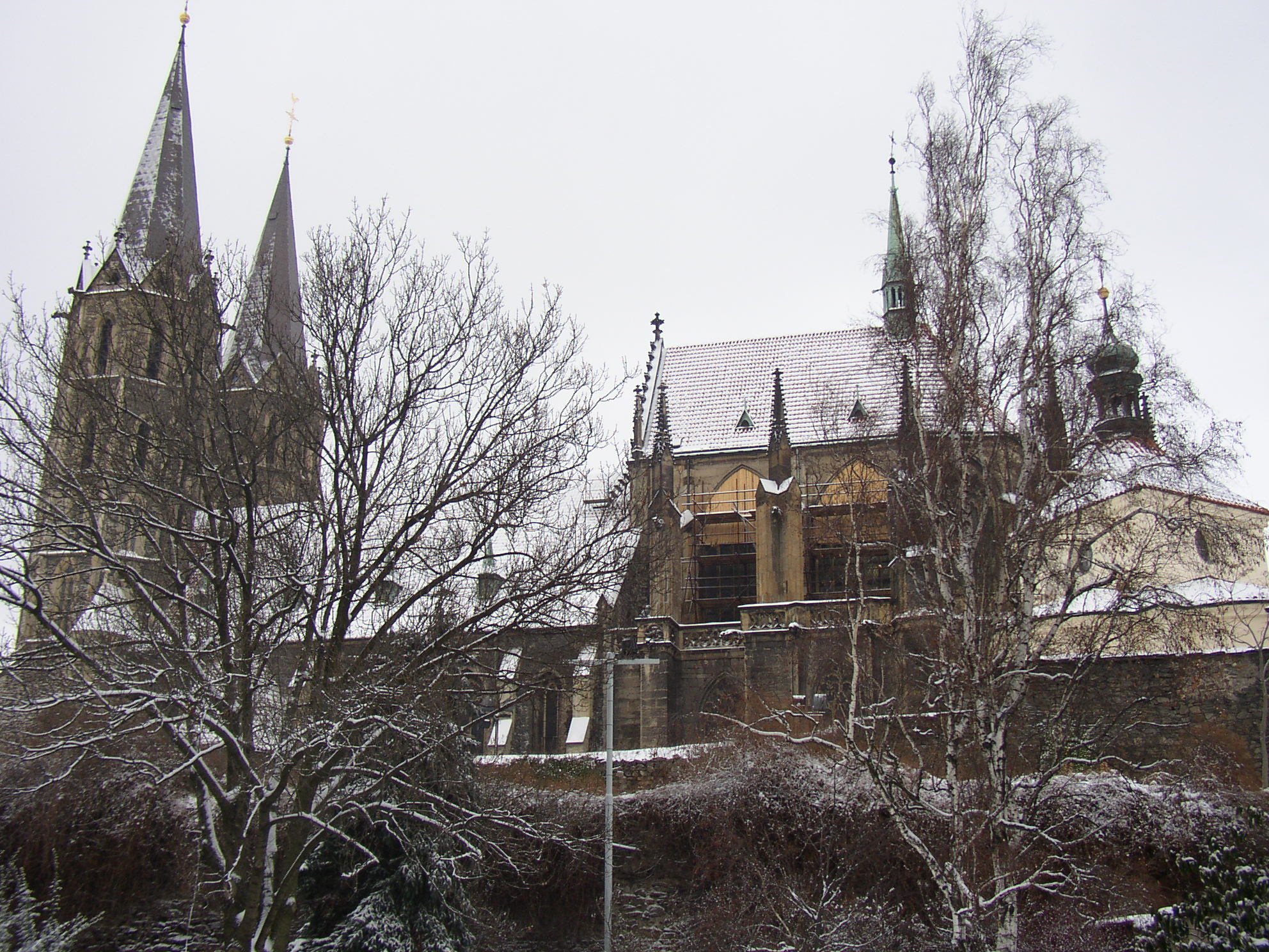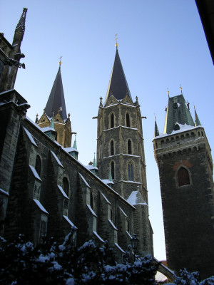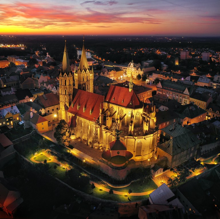 Stavba trojlodní basiliky s trojdílným závěrem začala zřejmě bezprostředně po založení města Přemyslem Otakarem II. (v polovině 50. let 13. století). Jako první byl budován závěr, kolem roku 1270 se předpokládá změna projektu (vložení příčné lodi, změna basiliky na síňové trojlodí), po útlumu za braniborské vlády se začalo stavět západní dvojvěží, průčelí a mezilodní arkády na masivních sloupech. Trojlodí s transeptem bylo dokončeno na přelomu 13. a 14. století.