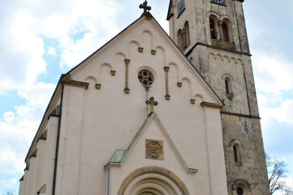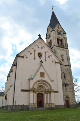 Stavba je svým průčelím orientována na františkánský klášter v Hájku, se kterým tak vytváří duchovní jednotu. Kostel byl vybudován v novorománském stavebním stylu v letech 1896-98 dle plánů předního architekta sakrálních staveb Eduarda Sochora (1862-1947). Dle jeho návrhu je také vytvořeno vnitřní vybavení chrámu. Tato stavba nahradila starý gotický kostel z roku 1615. Podle jeho návrhu je také vytvořeno vnitřní vybavení chrámu - výjimku tvoří soudobé vybavení liturgického prostoru od německého umělce Egina Weinerta (1920 – 2012).