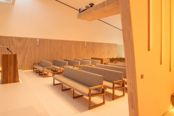 Interiér tvoří kombinace dřeva a bílé barvy s odkazem na propojení přírody a duchovna. Za kazatelnou je umístěna několikametrová křtitelnice pro křest ponořením, v případě nepoužívání je zakryta dřevěnou skulpturou.
