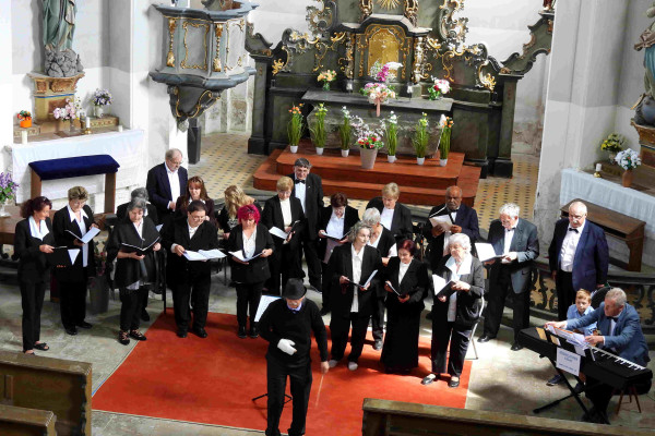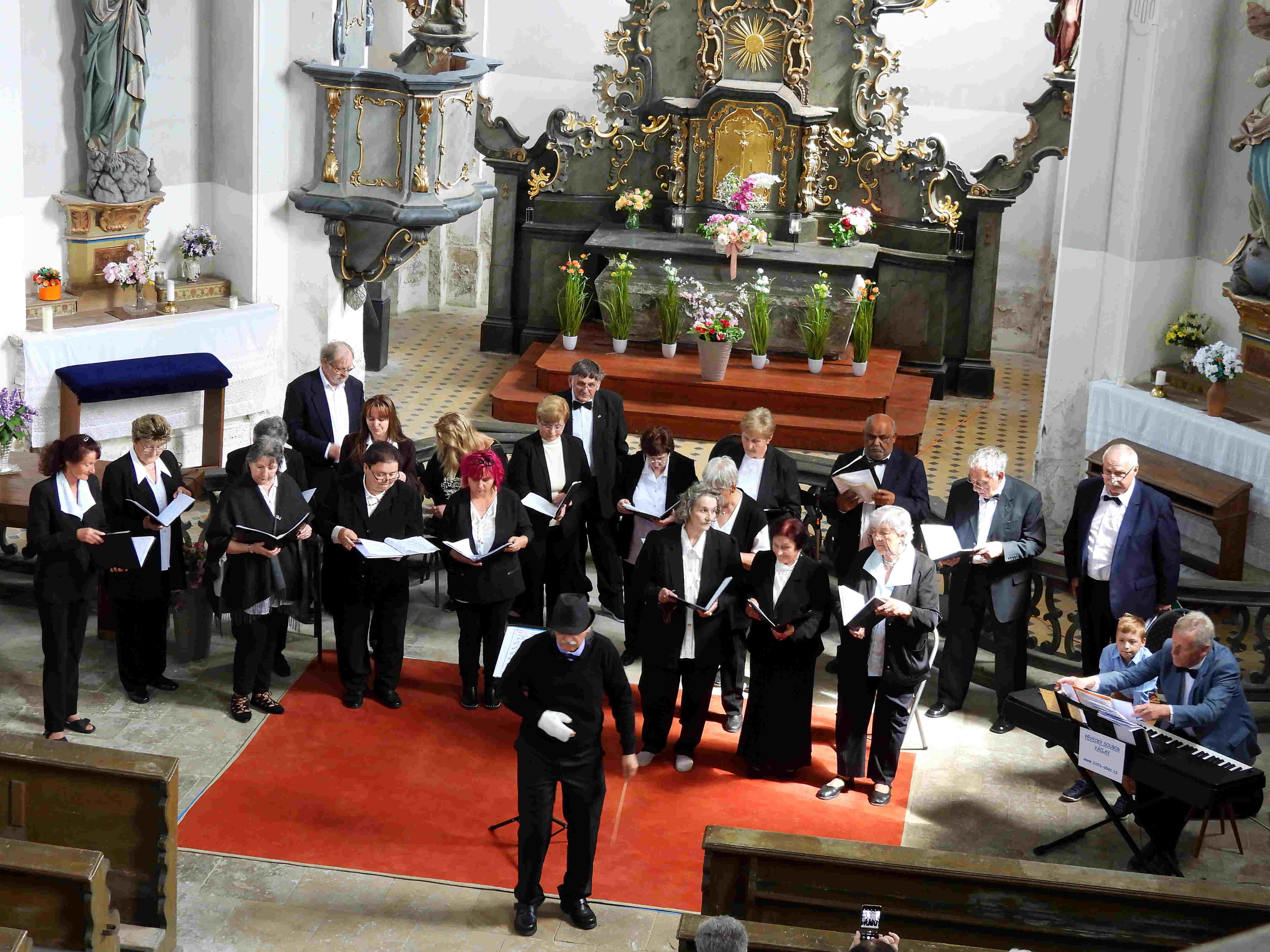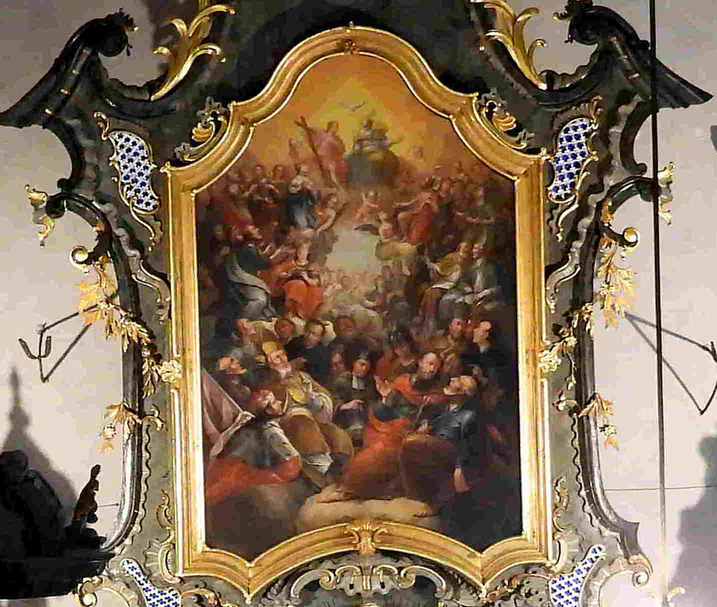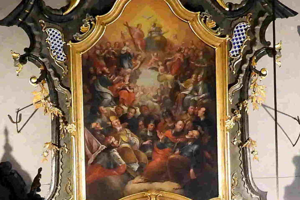 Hlavní oltář je dřevěný, bohatě řezaný, rámový, rokokový. Ve středu oltáře je majestátní obraz Všech Svatých od F. Dllingera z r. 1768. Nad obrazem je socha Boha Otce. Na brankách vedle oltáře jsou sochy svatého Václava a svaté Ludmily.