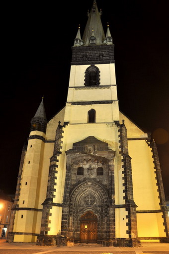Římskokatolický arciděkanský kostel Nanebevzetí Panny Marie se nachází v centru města nedaleko Mírového náměstí. Od nedávna jej obklopuje obchodní centrum Forum, přesto jeho šikmá věž zůstává jednou z výrazných dominant města. Původní románskou stavbu nahradilo gotické trojlodí z přelomu 15. a 16. stol. s osmibokou schodišťovou vížkou v jeho severozápadním rohu. Dnešní novogotická podoba pochází z konce 19. stol. Nejcennějším prvkem vnitřního zařízení je pozdně gotický křídlový oltář. Při bombardování v roce 1945 byl kostel silně poškozen a jeho věž se vychýlila asi o 2 m, čímž se stala nejšikmější věží střední Evropy.
