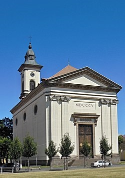 Postaven byl v empírovém slohu v letech 1805-1810 podle projektu Ing. Heinricha Hatzingera a hraběte Julia ď Andreise jako vojenský posádkový kostel. Jeho typická 56 metrů vysoká věž s hodinami je vidět z dalekého okolí a slouží jako výborný orientační prvek. Monumentální hlavní portál s vysokými řezanými vraty a vznosným průčelím sloužil k tomu, aby se dal při svátečních bohoslužbách zeširoka otevřít na ústřední městské náměstí, jinak je běžně kostel přístupný z jižní strany vedlejším schodištěm. Identický kostel byl postaven v sesterské pevnosti Josefov.
