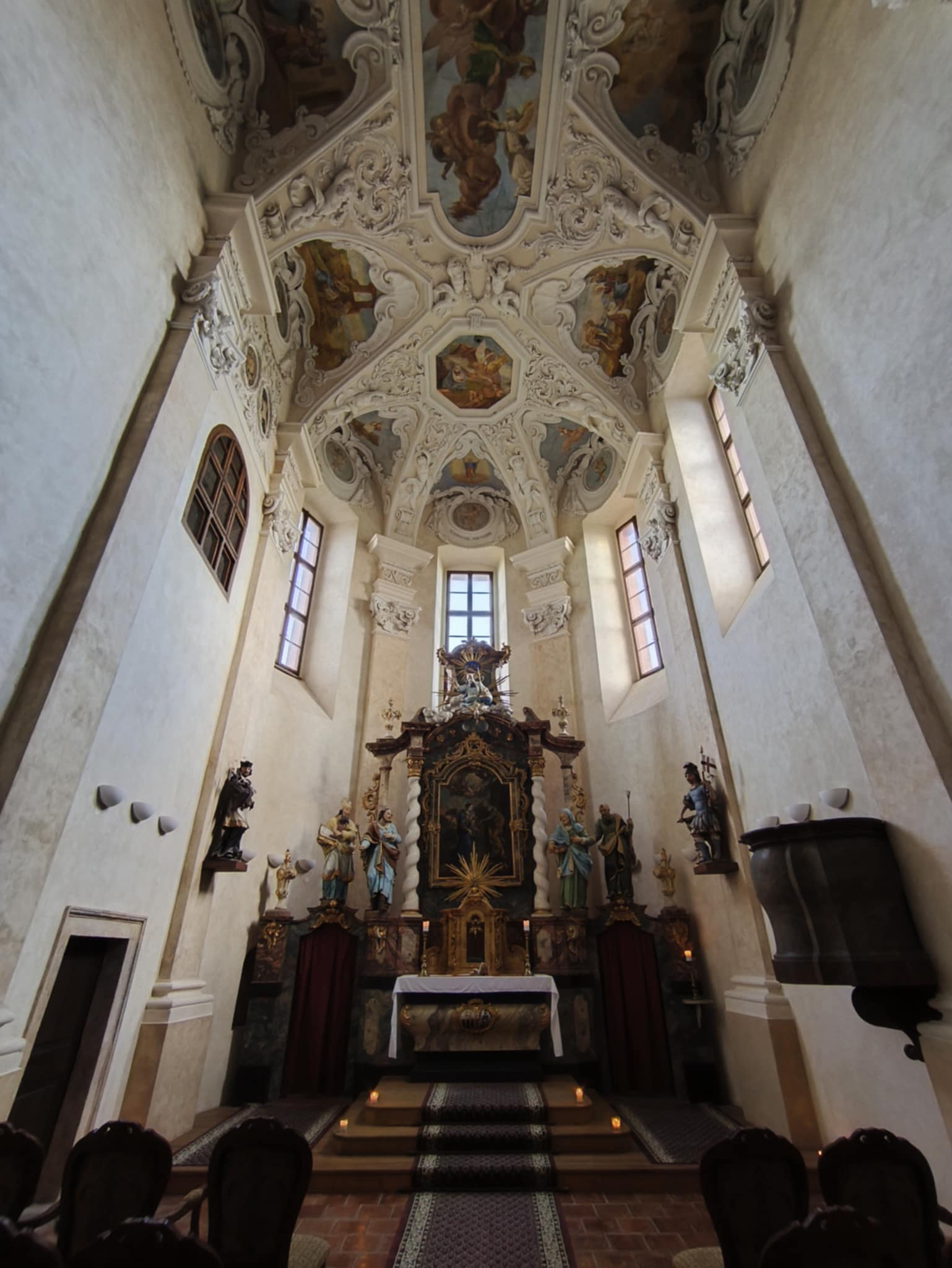 Lunetovou klenbu zdobí tři nástropní zrcadla Nanebevzetí Panny Marie, Svatá rodina a Hagar s Ismaelem.