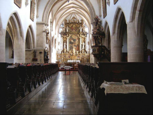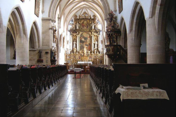 Kostel, který můžete v rámci Noci kostelů navštívit, se může honosit basilikálním trojlodím s protáhlým presbytářem uzavřeným pěti stranami osmiúhelníku. Jeho překrásné klenby byly vztyčeny v druhé polovině 15. stol. Pozoruhodné jsou také bohatě plasticky řešené konsoly přípor s figurálními a rostlinnými náměty. Okna jsou členěna gotickými kružbami. Ve 2. pol. 17. stol. byla ke kostelu přistavěna kaple sv. Antonína. V barokní době vytvořili františkáni vstupní průčelí kostela a upravili kruchtu, jejíž raritou jsou zdobené chórové lavice, v nichž se řeholníci modlili breviář, umístěné velmi netypicky za varhanním strojem.