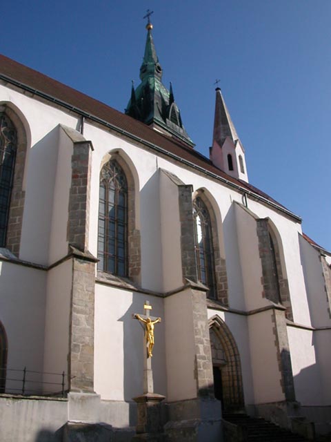 Chrám s městskou věží tvoří dominantu starého města. Jedná se o chrám farní, od roku 1625 s titulem proboštský. Byl zbudován v gotickém slohu ve 14. stol. Ještě v 17. stol. se z věže 68,3 m vysoké ozývalo až 7 zvonů, z nichž největší, Knaur, byl po Zikmundu z pražského chrámu sv. Víta druhým největším zvonem v Čechách. K severní lodi byla v letech 1489 - 1506 přistavěna tzv. Špulířská kaple, jež se řadí po bok umělecky nejcennějších staveb pozdní jihočeské gotiky. Pozoruhodná je její kroužená žebrová klenba, z níž dolů shlížejí plastické postavy zvířat. V kryptě pod presbyteriem kostela odpočívají pozůstatky pánů z Hradce a Slavatů. Původní interiér kostela se bohužel téměř nedochoval, současná výzdoba pochází z 19. stol. Při zničujícím požáru v r. 1801 spadlo a rozbilo se všech 7 zvonů, oheň zachvátil i oltář s malbami od Petra Brandla. Chrám byl později nově zaklenut a věž byla snížena o jedno patro.