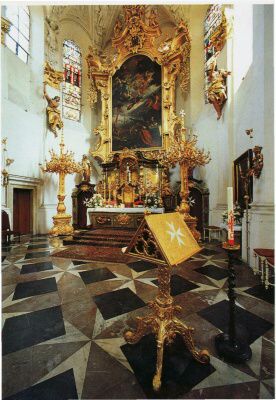 Ve štítu kostela je umístěna dřevěná, pozdně gotická socha Madony. Hlavní oltář s řezbami představujícími výjevy ze života apoštola Pavla je od J.P.Vendy z r. 1730. Kazatelna asi od téhož autora je z doby před r. 1750. Sochy světců na konzolách hlavní lodi jsou od J.J. Bendla (po r. 1651). Hlavní oltářní obraz (Panna Maria a Jan Křtitel - pomocníci maltézských rytířů v bitvě s Turky u Lepanta r. 1571) je dílem Karla Škréty ze 60. let 17. stol. Od Škréty je také obraz sv. Barbory na bočním oltáři. V hlavní lodi stojí mramorová socha velkopřevora Rudolfa Coloredo-Walsee, který se v 17. stol. zasloužil o přestavbu kostela a kláštera. Socha je od E. Maxe z pol. 19. stol. Křížová cesta na stěnách kostela je od řádového malíře Vachka. Tepané mříže ze 16. a 17. stol byly doplněny novými podle návrhu J. Fanty. Kostel prošel rozsáhlou renovací v l. 1965 - 87.