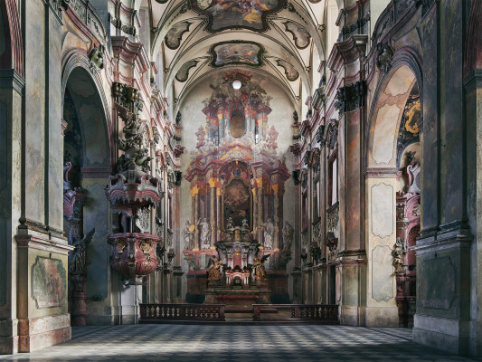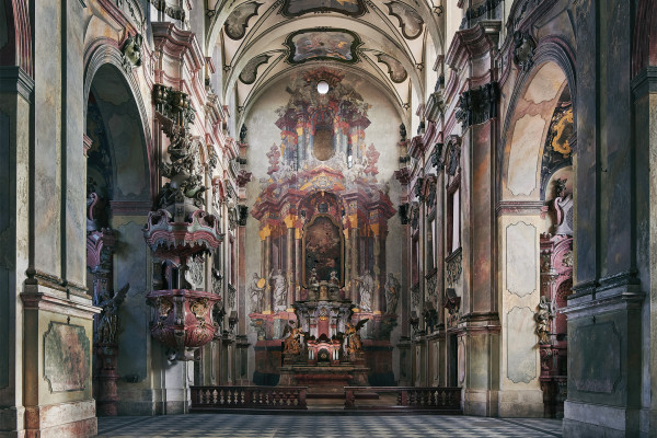 The church, together with the site of an older college, is a dominant feature in Litoměřice. It was built for the Society of Jesus (the Jesuits) by the architect Octavio Broggio in several stages between 1701 and 1731; in the initial phases of construction Octavio worked with his father, Giulio. The effect produced by the church’s interior is magnified by its ornamentation, which dates from the latter half of the 18th century. The trompe l’oeil main altar from 1772 is the work of Josef Kramolín and Adam Lauterer.