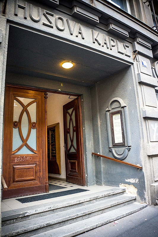 Stanice metra, tramvají. autobusů PALMOVKA, pak směrem nahoru na Sokolovskou ulici a naproti hlavní poště Prahy 8 je ulice U Pošty, kde je v čísle 6 Husova kaple.
