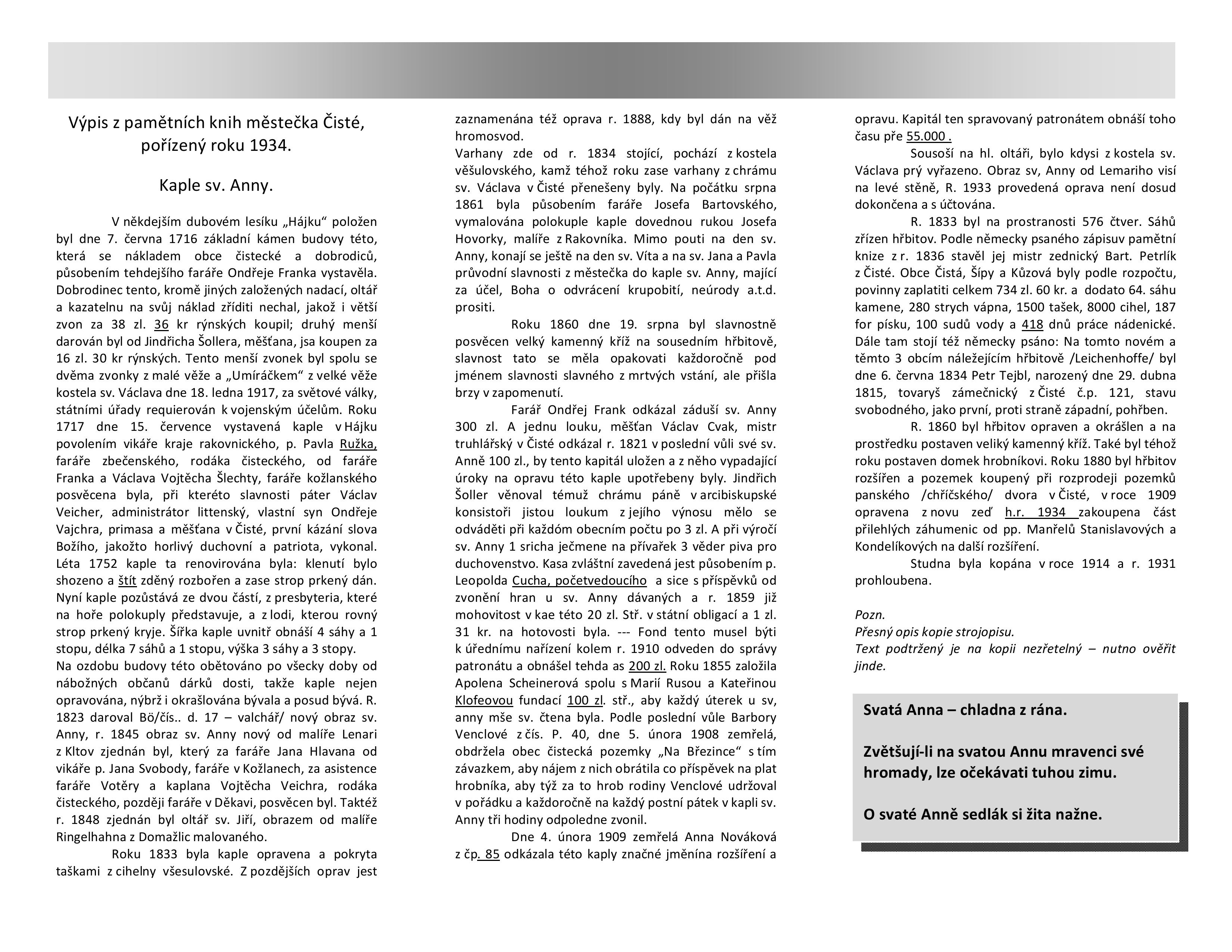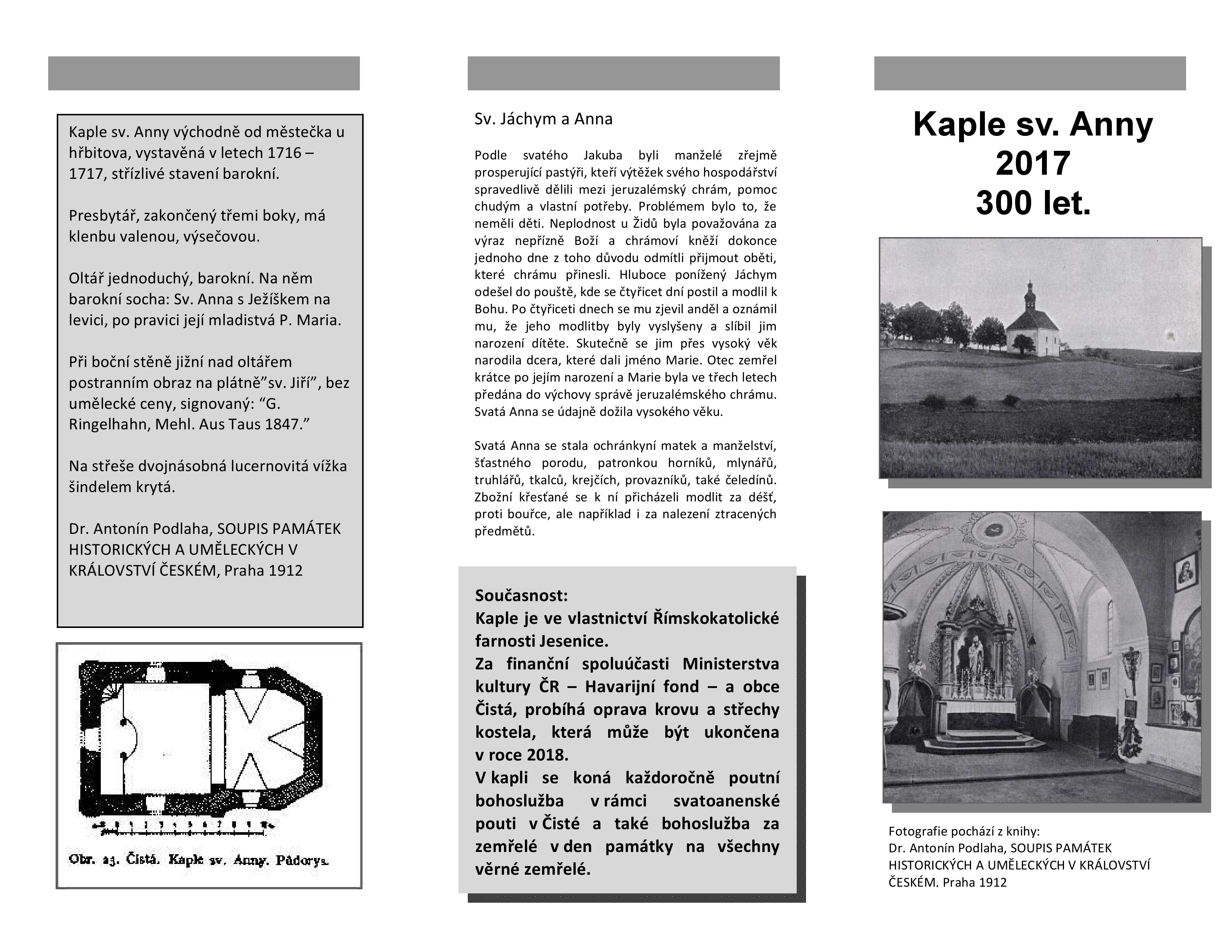 Barokní kaple sv. Anny byla postavena v letech 1716 až 1717 ze sbírky farníků. Farář Ondřej Frank dal na své náklady pořídit oltář, kazatelnu a jeden zvon. Druhý koupil měšťan Jindřich Šoler. Kaple je čtvercová s trojbokým závěrem. Fasády členěny lizénovými rámci. V závěru je valená klenba s výsečemi, v lodi plochý strop. Klenba zde byla odstraněna roku 1752, kdy byla celá kaple opravena. Ústředním bodem vnitřního zařízení je jednoduchý oltář. Na něm je socha svaté Anny s malým Ježíšem na levici. Po pravici stojí mladistvá Panna Marie. Na střeše kaple je dvojnásobná lucernová vížka, která byla původně kryta šindelem, stejně jako ostatní střecha. Dnes je střecha tašková a vížka pobitá plechem. V těsném sousedství kaple se nachází nový čistecký hřbitov, založený zde roku 1833.