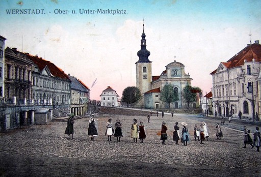 Historická fotografie kostela, který byl ozdobou verneřického náměstí - zdroj archiv Města Verneřice