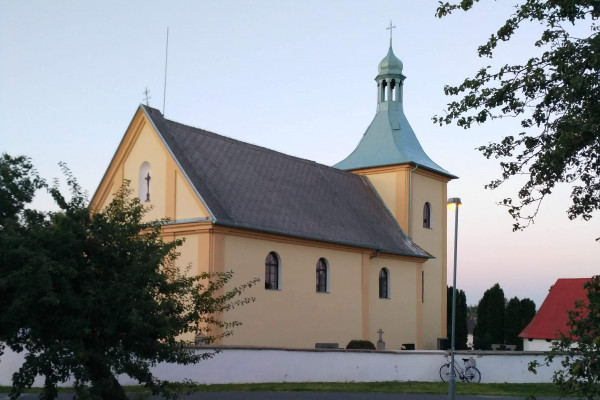 Raně barokní jednolodní kostel z konce 17. století obdélného půdorysu s hranolovou věží situovanou za mírně odsazeným pravoúhlým presbytářem se nachází uprostřed hřbitova na jižním konci vsi. Hřbitovní areál, kde odpočívá napříkald slavný český herec Pavel Landovský, obíhá zděná ohradní zeď s vetknutou budovou márnice.