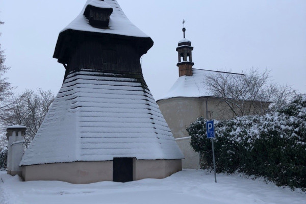 Součástí areálu je také ohradní zeď se vstupní branou a dřevěná zvonice polygonálního půdorysu. Jedná se o osmibokou stupňovitou dřevěnou stavbu se štenýřovou konstrukcí. Postavena byla po polovině 18. století na místě starší šestiboké vzpěradlové zvonice ze 16. století. Ve zvonici jsou umístěny dva historické zvony: menší, takzvaný Poledník, má rozměr asi 85×85 cm a byl ulit v roce 1542 zvonařem Václavem Konwarzem. Větší zvon, o rozměrech asi 100×100 cm, je nazýván Ježíš nebo také Jan, lidově Hranáč, a byl odlit v roce 1606 zvonařem Beranem. Věnoval jej Zikmund Wazziczky – semínsky richtář. Je na něm nápis po celém obvodu na spodní části: „Hle já zvon, nikdy nezvěstuju klam, chválím Boha pravého, lid svolávám, shromažďuji kněžstvo.“