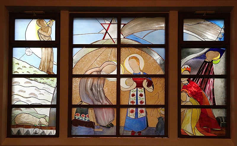 Okno z východní strany: Betlém – narození. Dominuje vánoční téma.