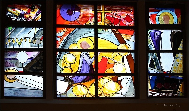 Vitrážová okna v kostele Nanebevzetí Panny Marie v Blatničce r. 2013.