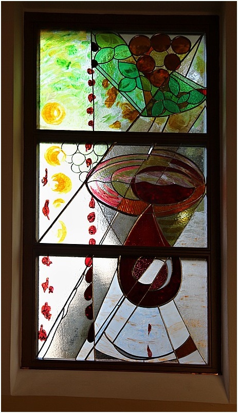V levém okně ze zlatých hroznů vinice prosvítají kapky vína, krev Kristova padá do kalicha.Rudá barva dominuje v utrpení.