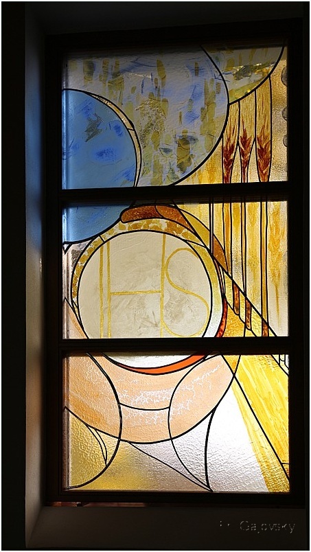 V pravém okně svítí veliká hostie i s písmeny IHS. Nad kalichem, rukou držících Tělo Kristovo, kreslí klasy obilného pole, odnož oblohy. Zlaté a něžné barvy narození.
