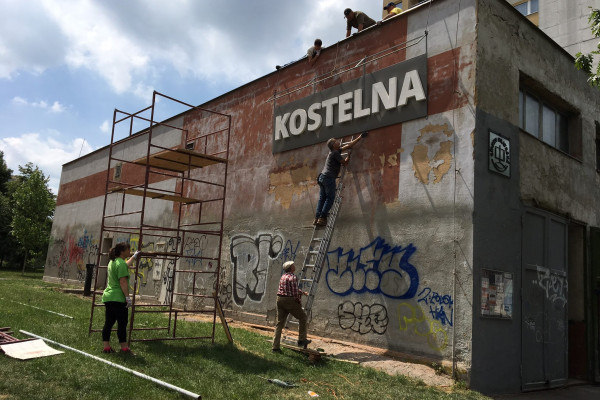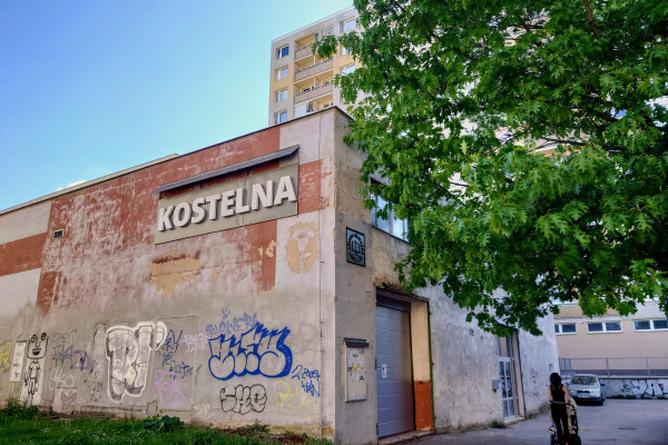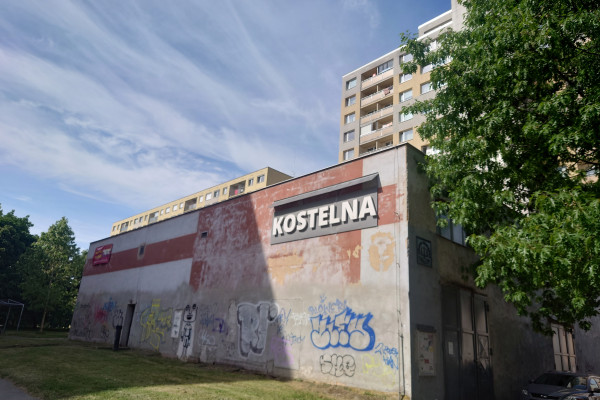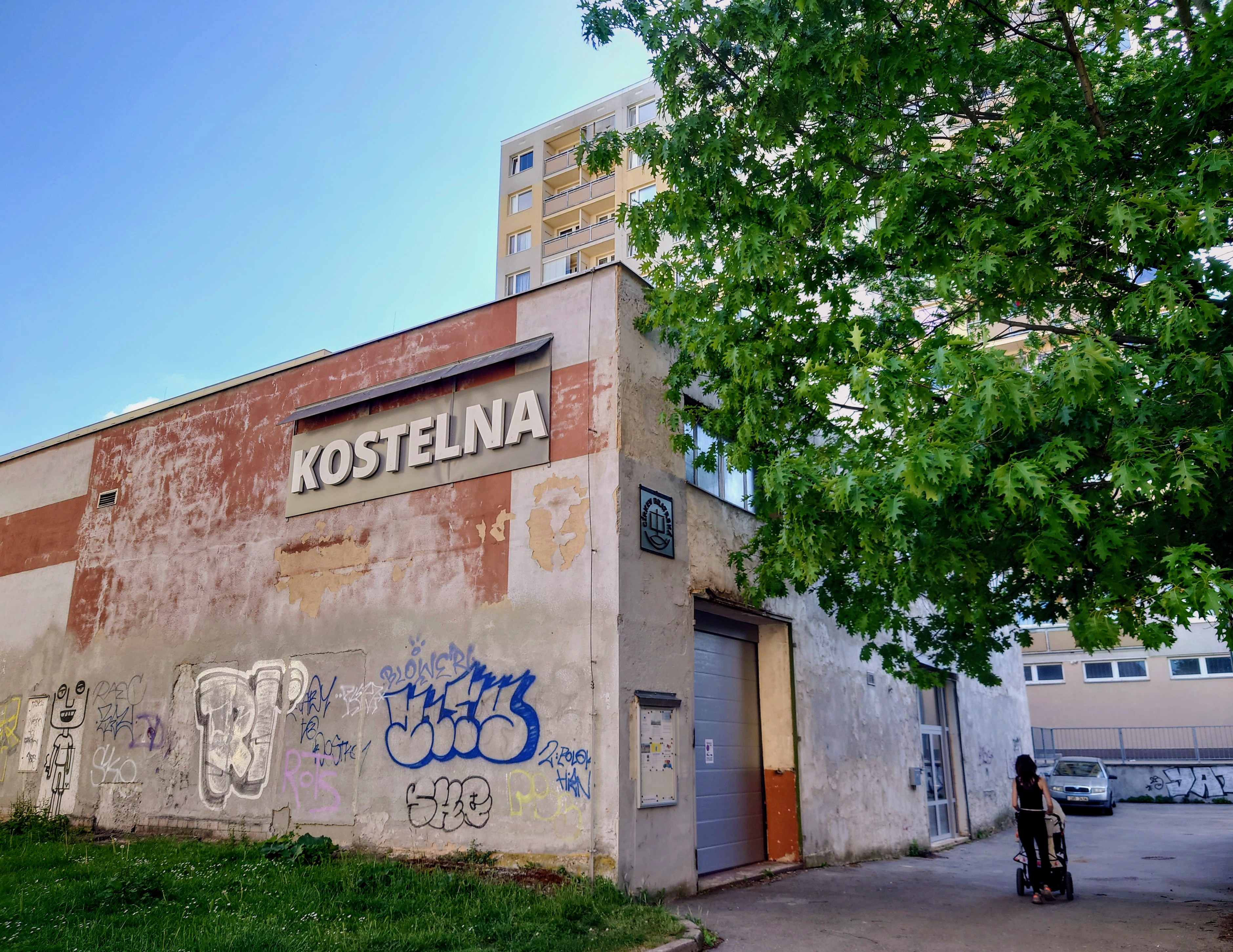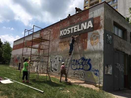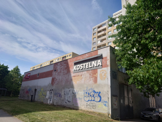 Kostelnu jsme museli radikálně upravit podle naší vize víceúčelového objektu. Rekonstruovali jsme dolní i horní místnosti (zdi, podlahy, topení, vodu, elekřinu), postavili nová sociální zařízení a na asi třetí pokus opravili stále zatékající střechu. Na podzim r. 2021 jsme s radostí vybourali díry ve zdech na dlouho očekávaná okna a od té doby máme konečně denní světlo, takže se v Kostelně už necítíme jako v kobce :-) V r. 2023 pokračovaly práce na vstupním portále, kde jsou teď krásné skleněné dveře, a máme také zbrusu nová garážová vrata. Plášť budovy zatím není opraven (snad na to dojde letos), takže hledejte otlučenou budovu červené a šedé barvy s různými graffiti pouličních umělců. Kostelna je v přízemí bezbariérová a její prostory je možné si pronajmout (pro schůze SVJ, burzy dětského oblečení apod.).