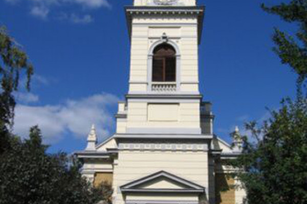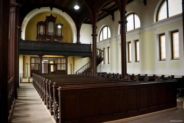 Kostel byl postaven v roce 1898 a je od té doby nepřetržitě užíván. Stavba je ve stylu novorenesančním s 35 m vysokou věží na jižní straně. Uvnitř je nápadný dřevěný strop a železné sloupy obložené dřevem, prostý stůl a kazatelna, celkem 360 míst k sezení. V kostele jsou funkční varhany, věžní hodiny a namísto původních tří zvonů zabavených za války jeden, který je nahradil.
