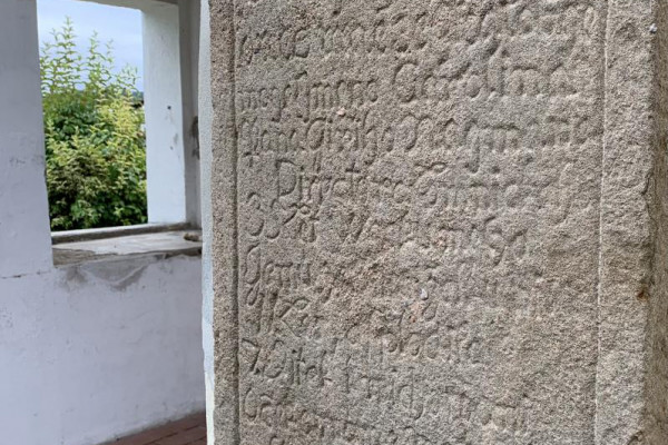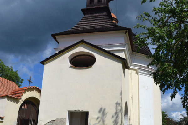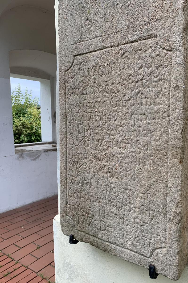 Ke kapli se přichází přes bývalý hřbitov, dnes malý parčík. Na zdi kaple je z této strany připevněna náhrobníková deska s červeného drásovského pískovce. Po staletí vystavená povětrnostním vlivům je silně zvětralá, vytesaný text, který zaplňuje většinu desky, je téměř nečitelný. Zcela dole lze rozeznat číslice i text: Umřela Ano 1776 dne 4. září. V zápisu v matrice zemřelých je k danému datu v kolonce úmrtí uvedeno: