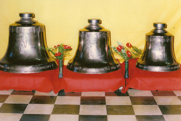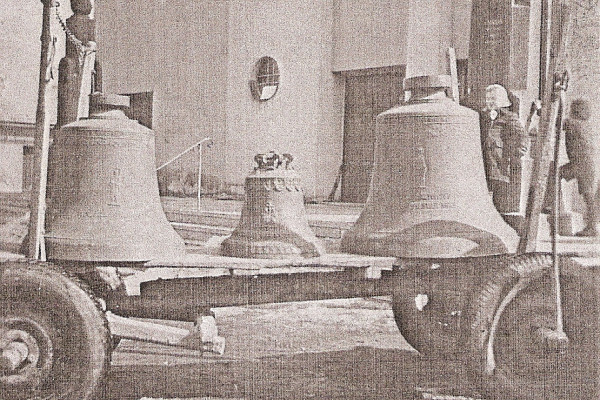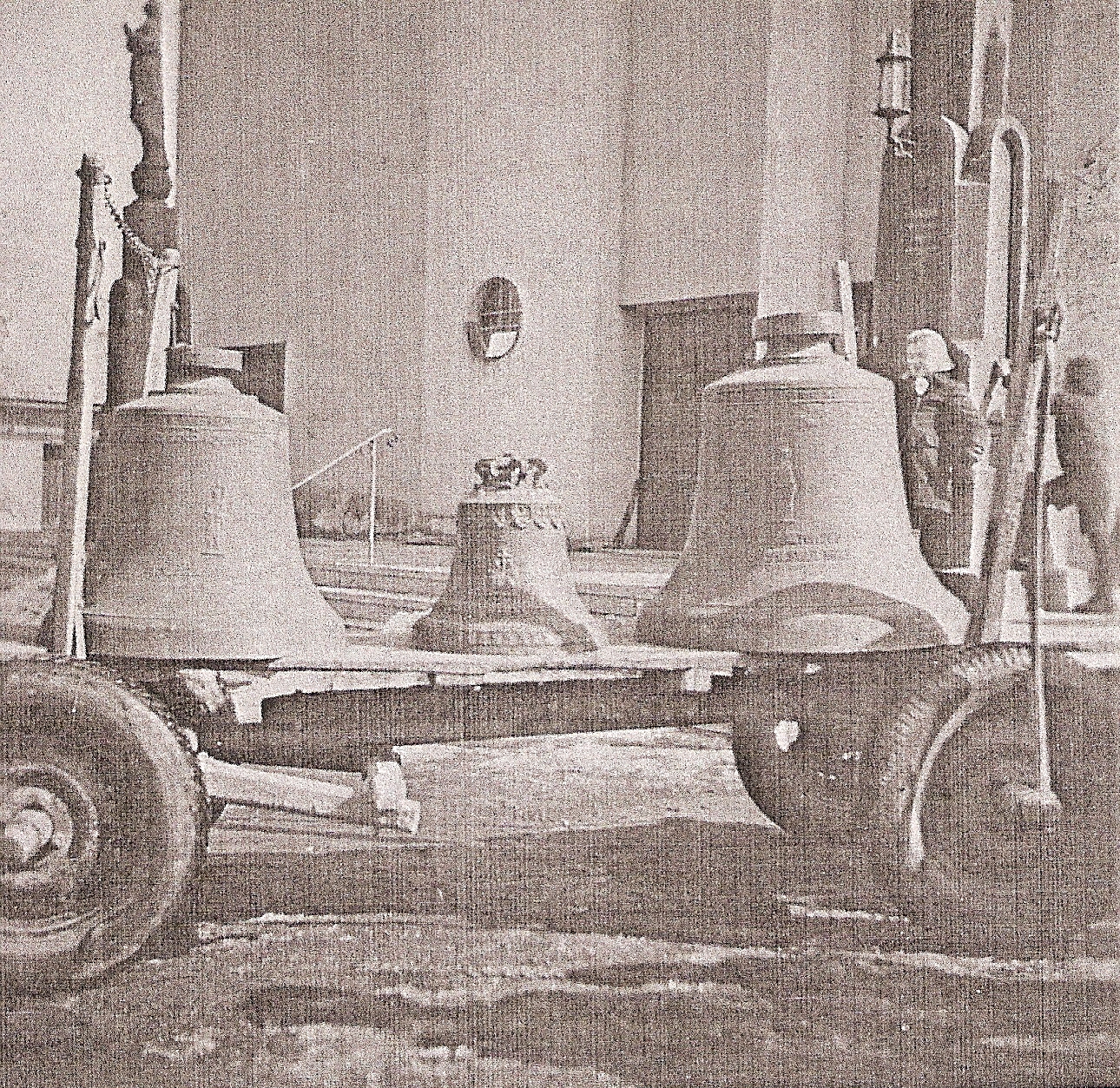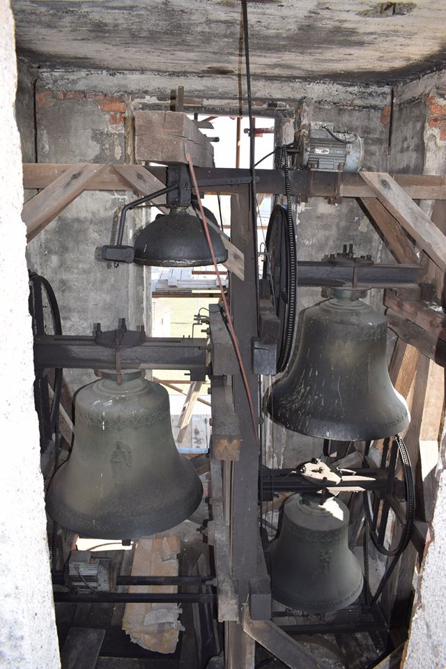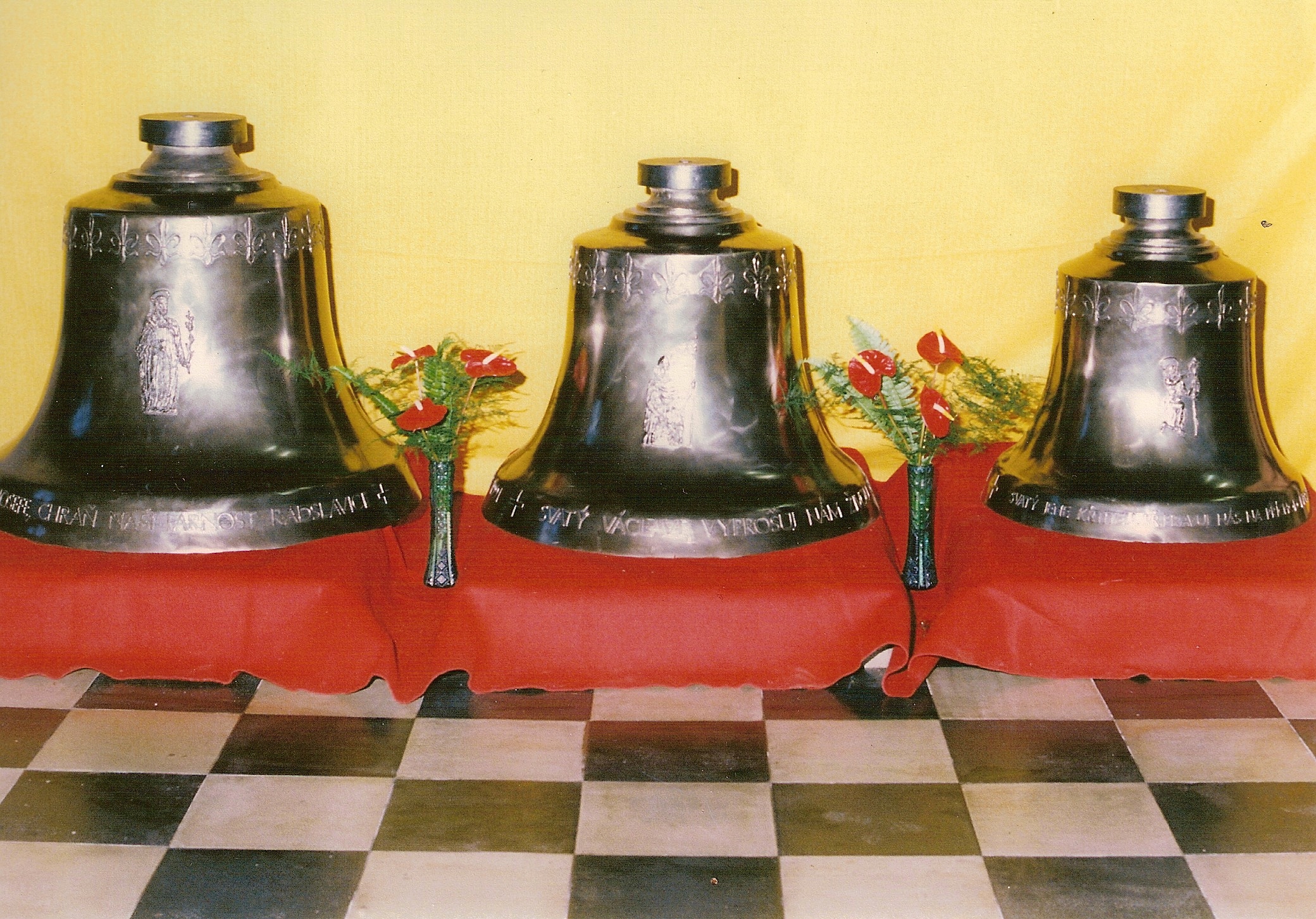 Jen pro úplnost uveďme, že původní tři zvony byly zabaveny za 2. sv. války pro válečné účely, a proto až do roku 1991 zněl z věže náhradní plechový zvon.