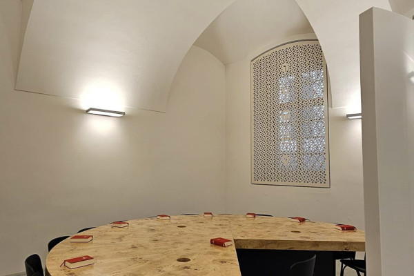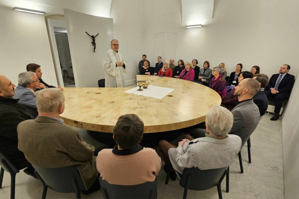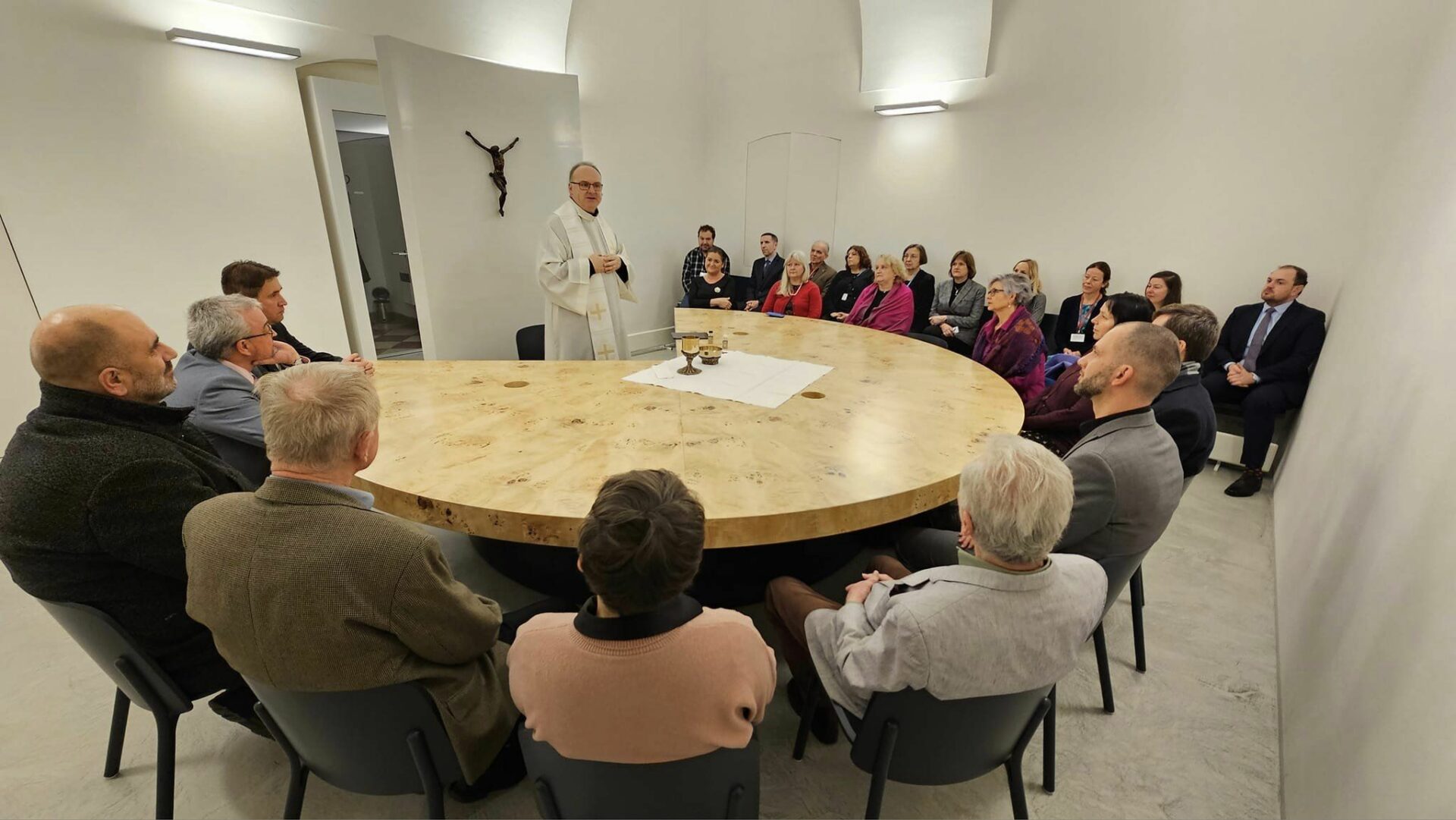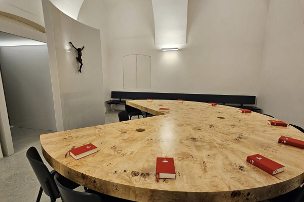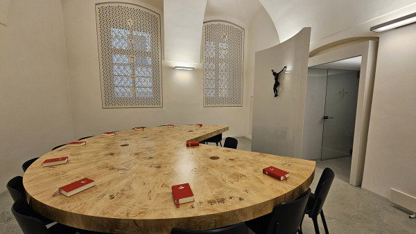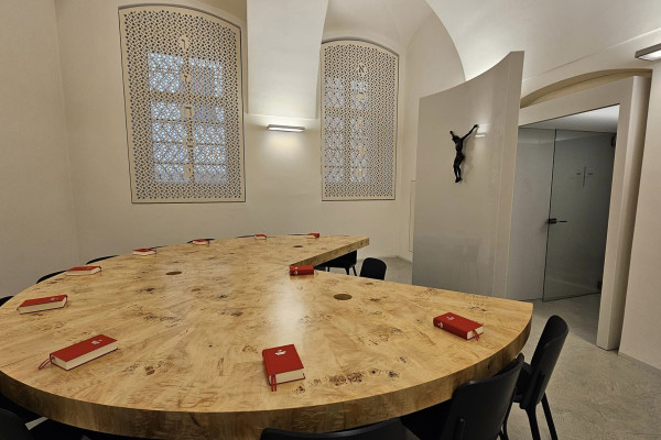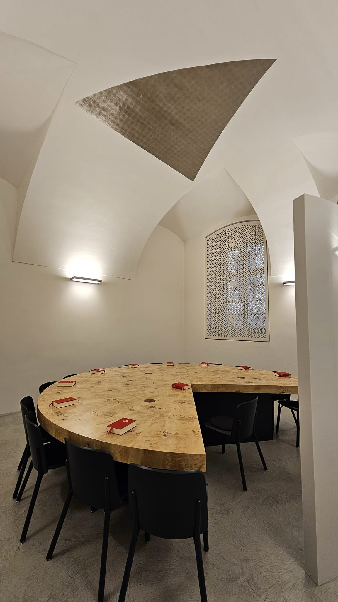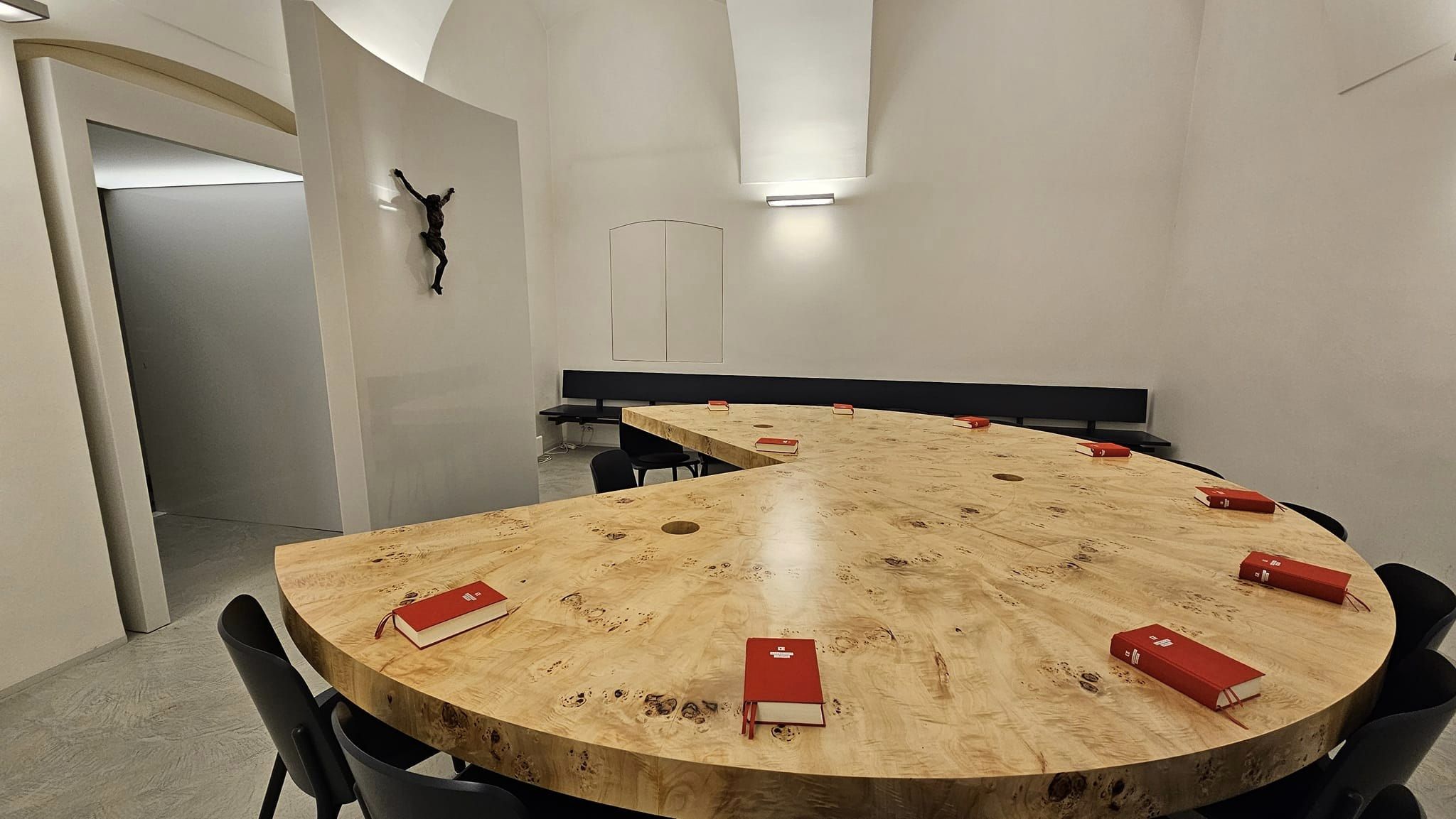 Do klenby kaple nad stolem je nově vepsán rovnostranný trojúhelník z bílého kovu, který pomyslně otevírá celý prostor ve směru vertikály procházející středem stolu do nekonečna. Trojúhelník slouží také jako odrazová plocha nepřímého osvětlení prostoru z trojice světel zabudovaných do stolní desky. Různé režimy osvětlení celé kaple umožňují měnit její atmosféru podle typu duchovního setkání.